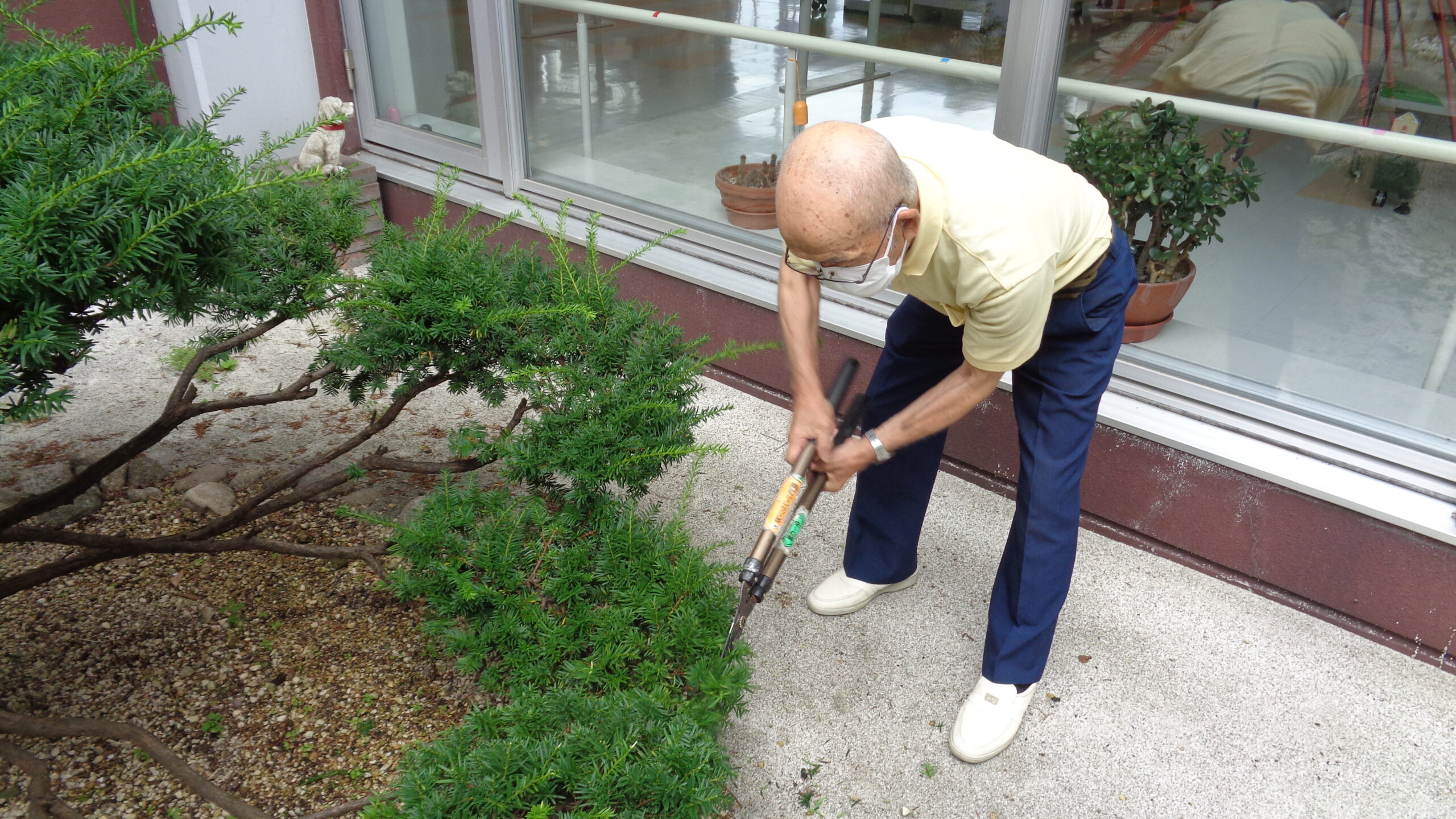 今回は、通所リハビリの利用者様に当施設の中庭にある木の剪定作業を行って頂きましたので、その時の様子をご紹介します(^-^)