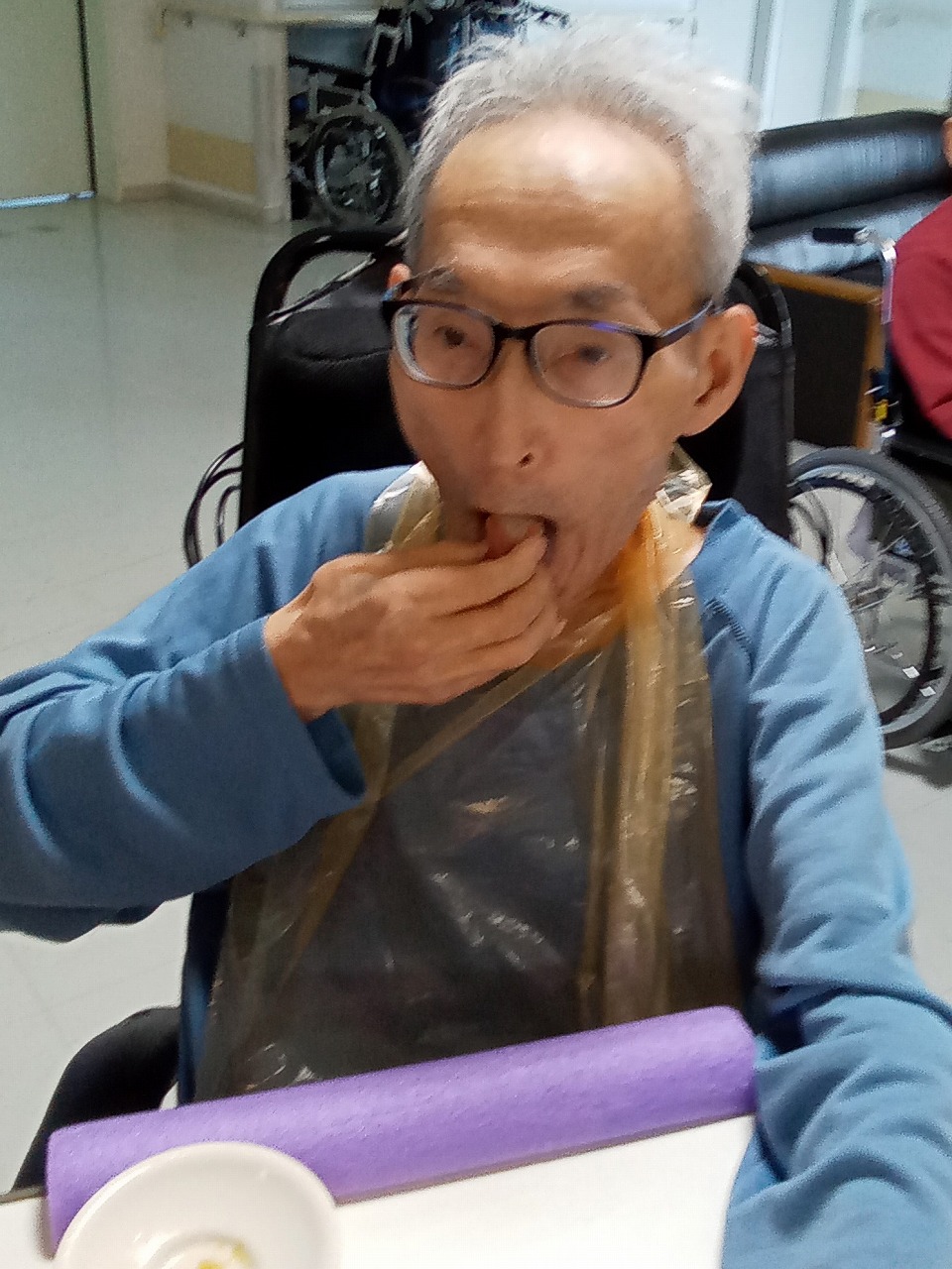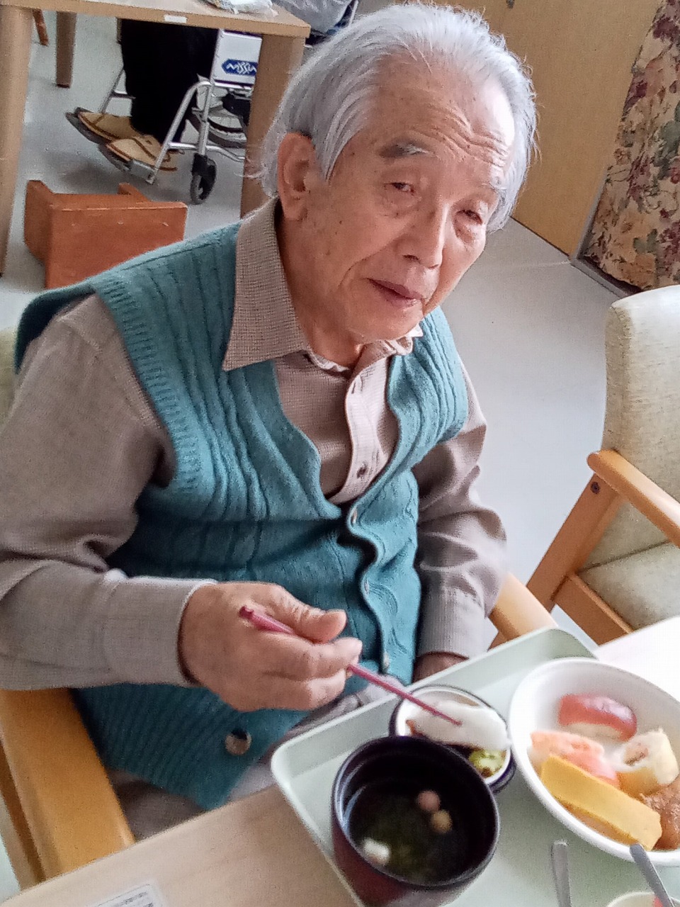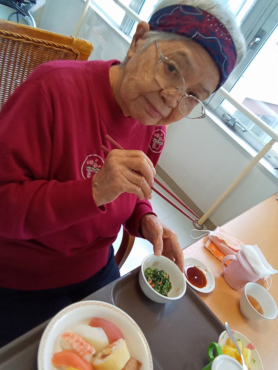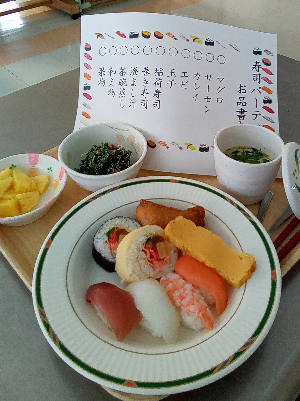 11月14日(月)寿司パーティーをとり行いました。年間行事の一環で、コロナ禍前は寿司職人が利用者様の前で寿司を握る実演もありましたが、ここ数年、職人さんを迎える事や、握り寿司の提供が難しい状況が続きました。今年は、感染対策、衛生対策をしっかりとり、利用者様の大好きな握り寿司を提供させて頂く事が出来ました。感染者が増えている状況の中で、実演の方は無かったのですが、何年か振りの握り寿司に、朝からワクワクが止まりません。ボリュームたっぷりな握り寿司と、みんな大好き茶わん蒸し、白和えと、果物で、笑顔一杯、お腹一杯になりました。
