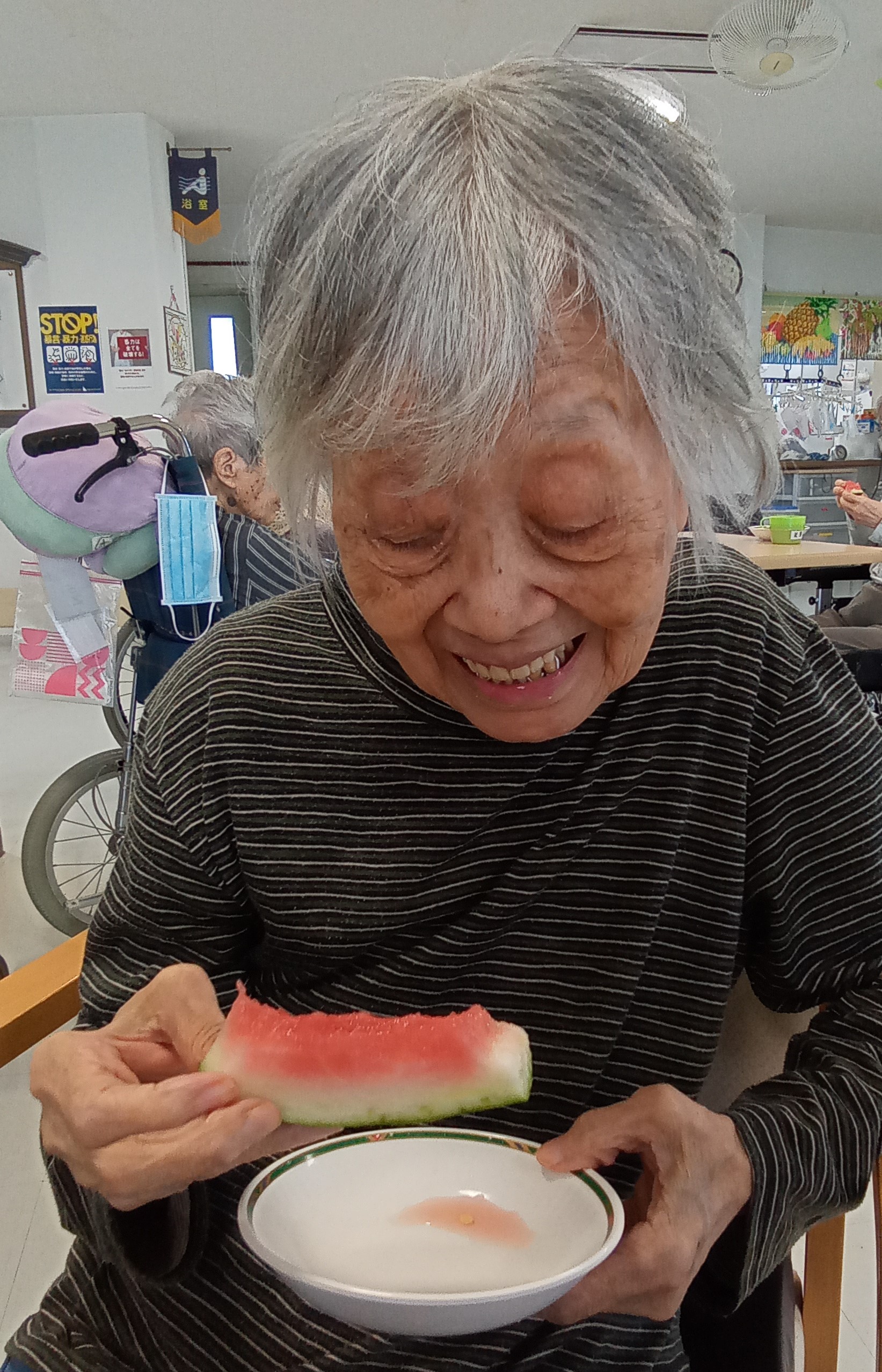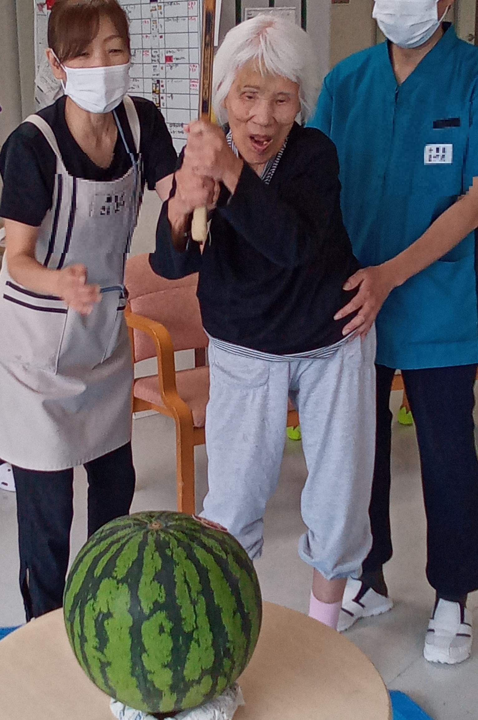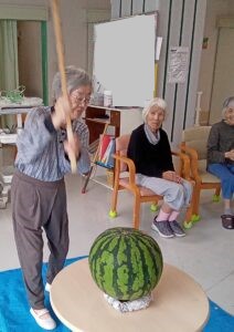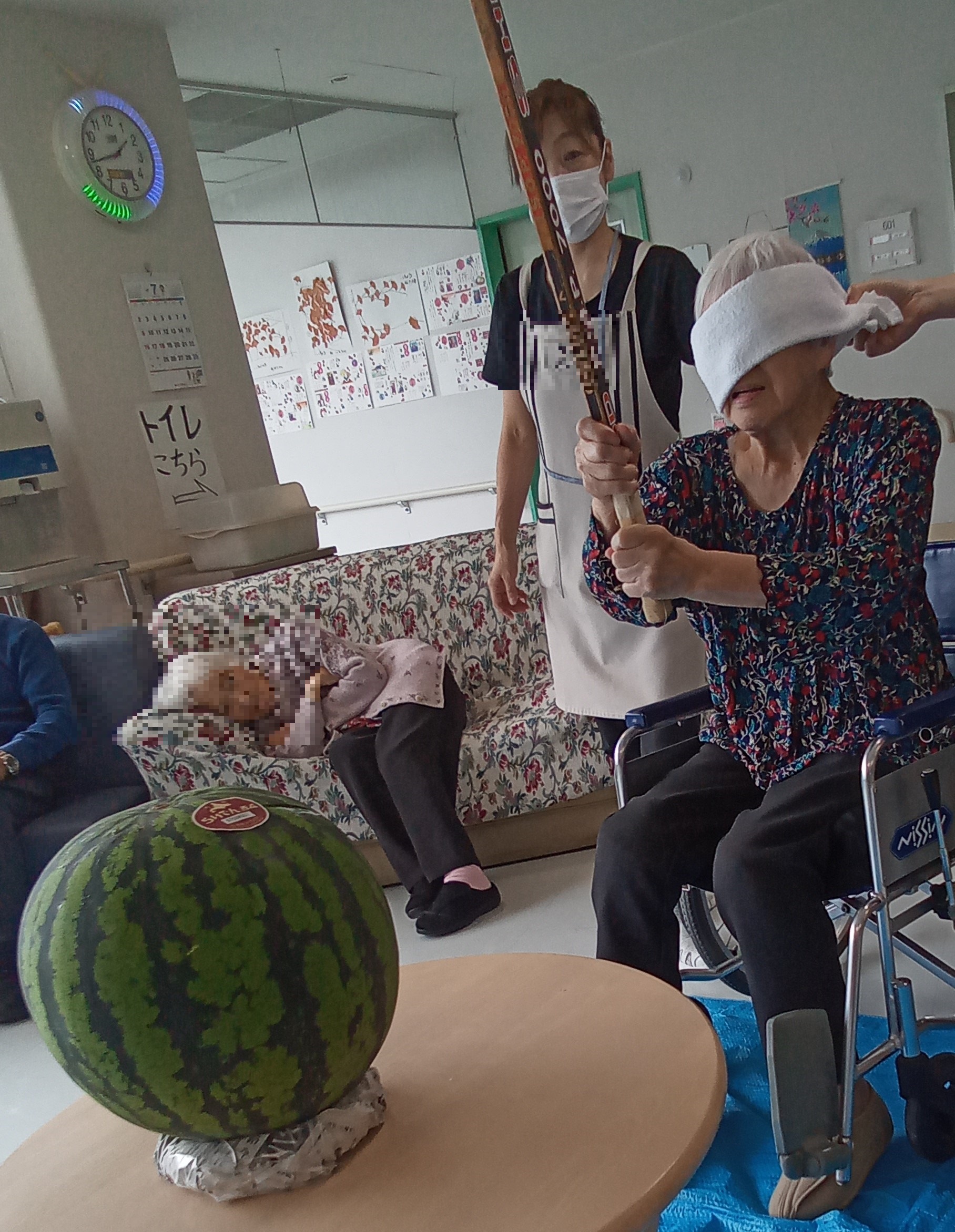 さて先日7月19日、3階のパノラマフロアにて皆さんでスイカ割りを行いました🍉