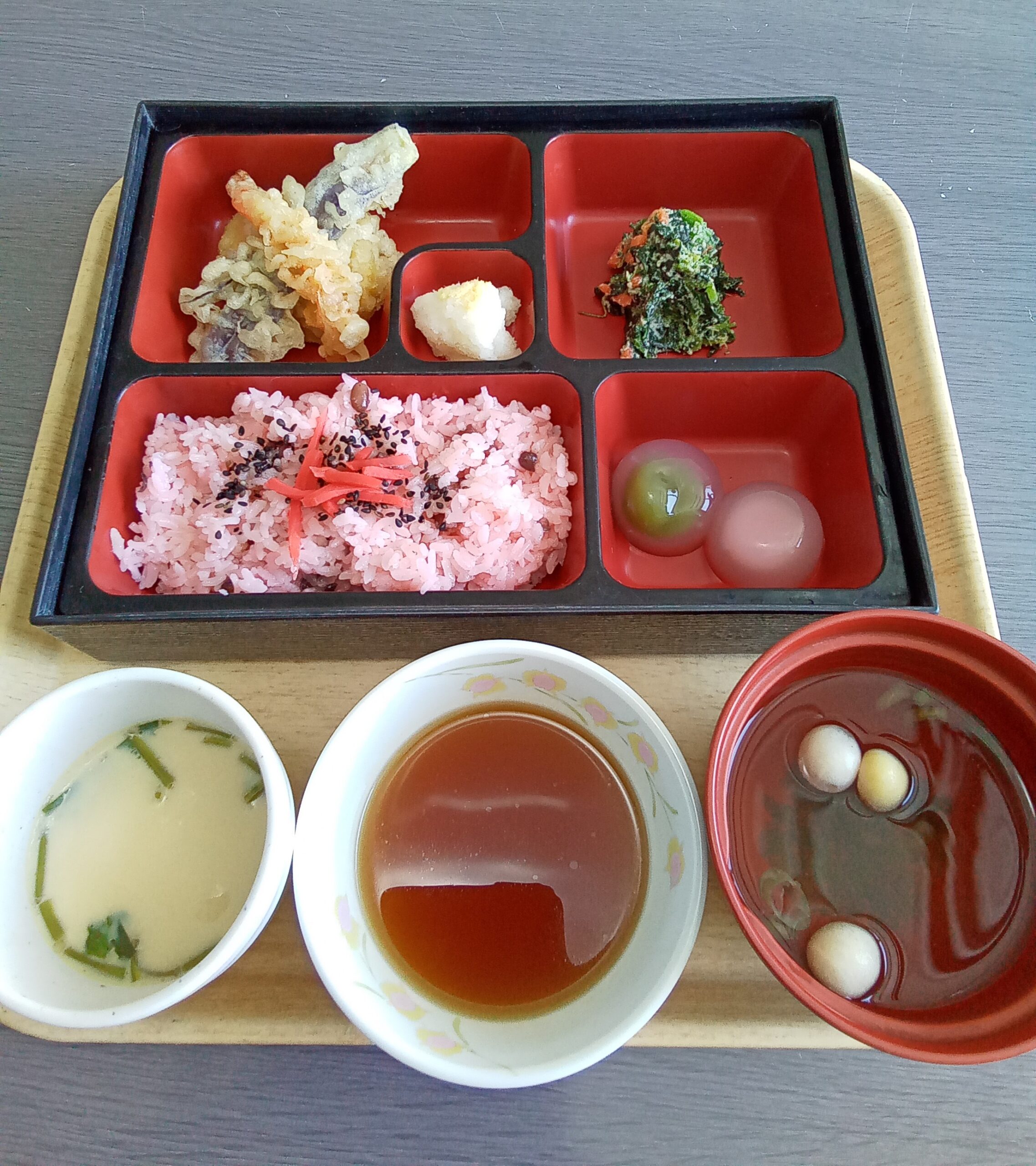 昼食は、お赤飯と天ぷらなどのお祝い膳でした。