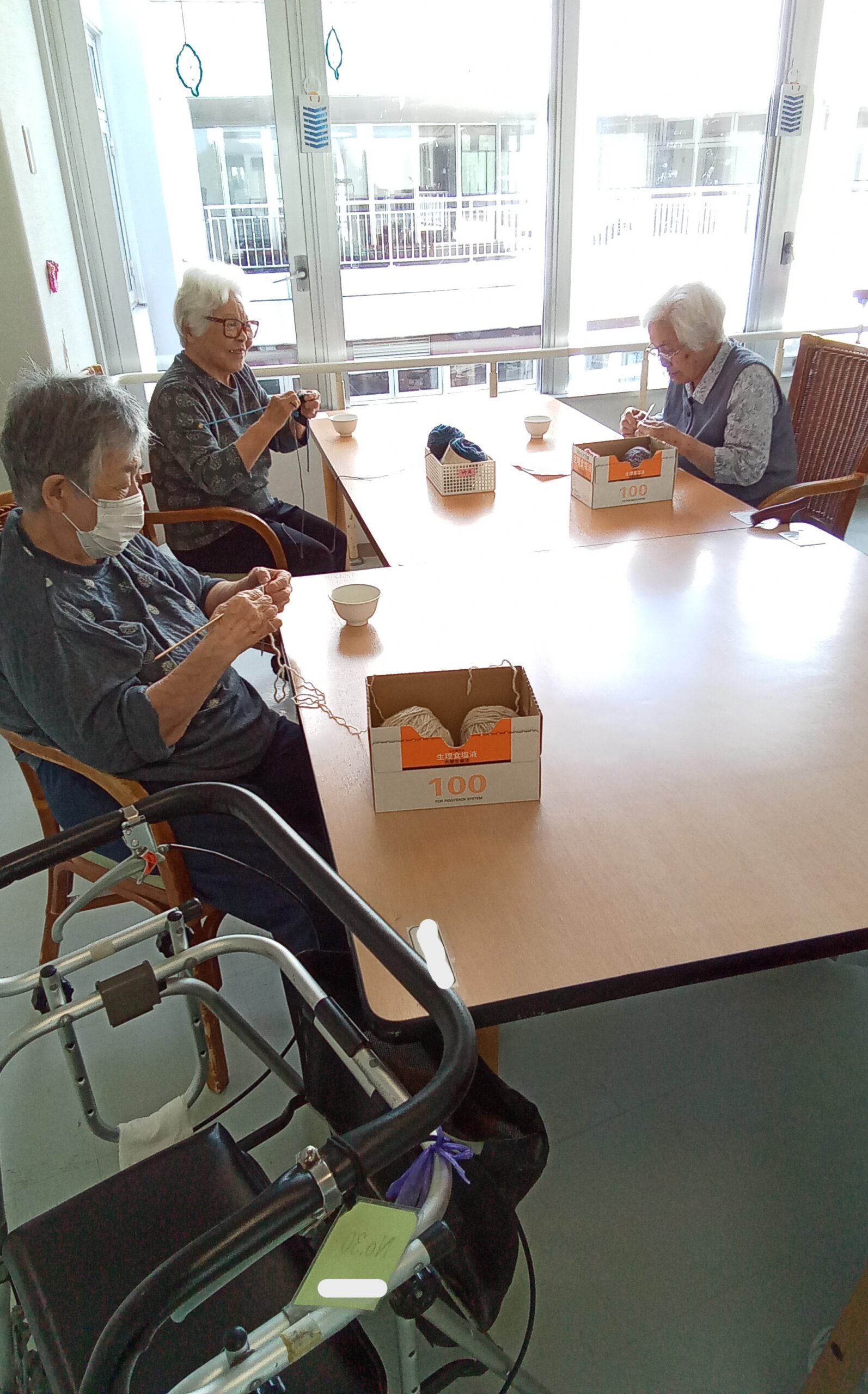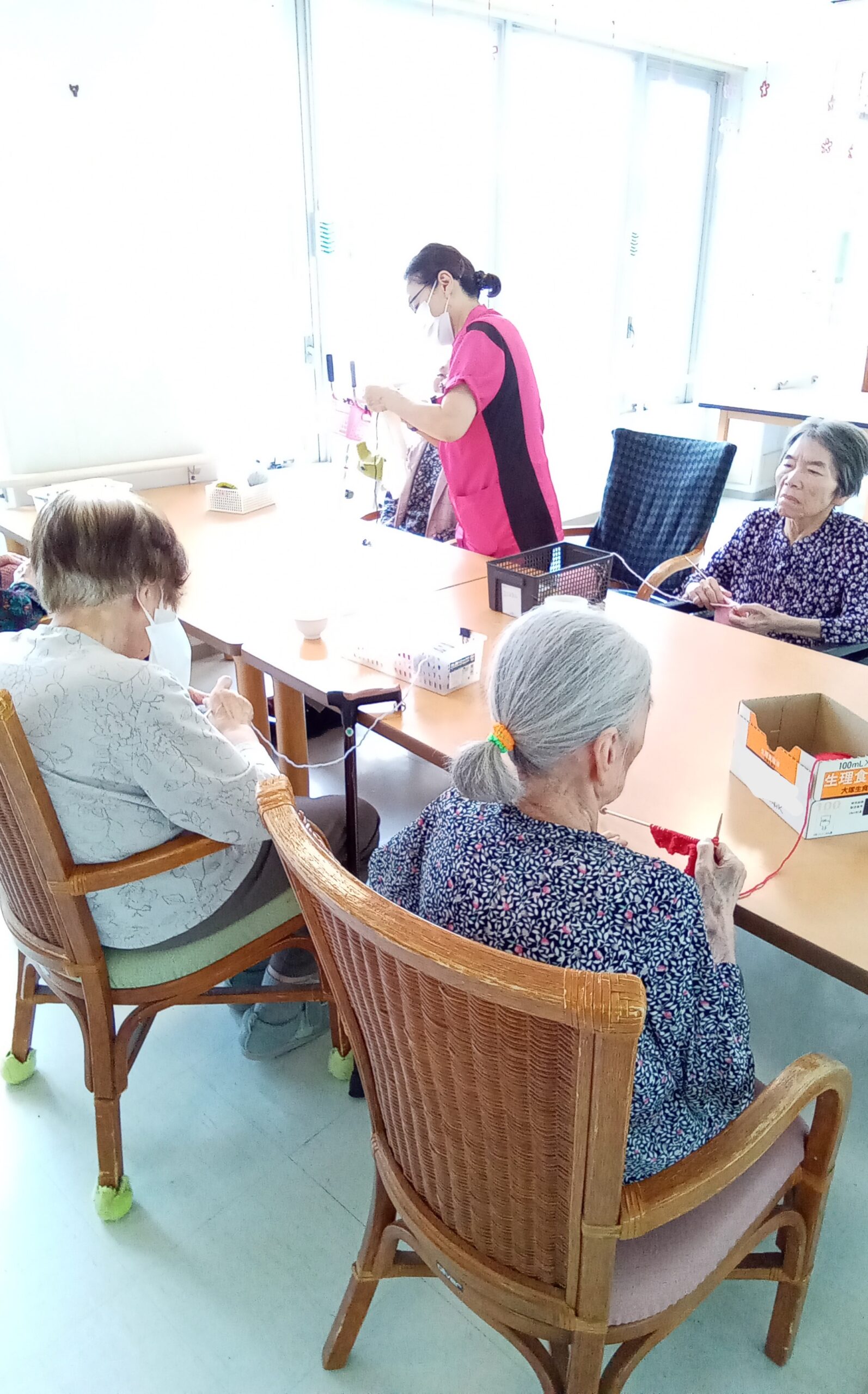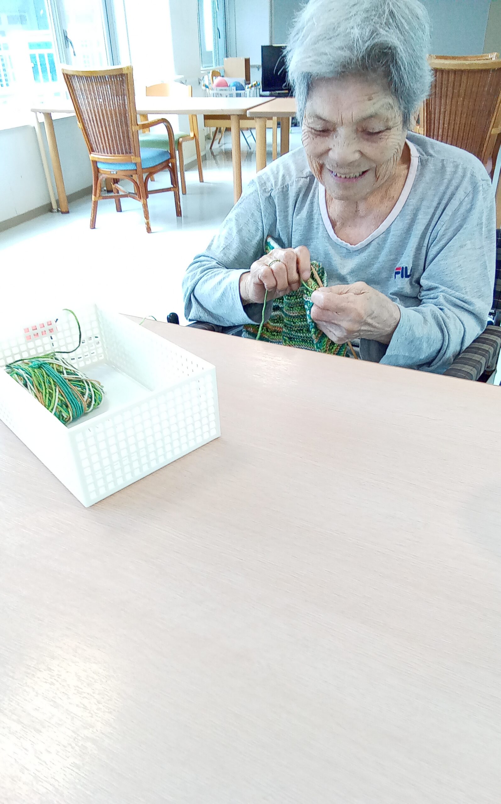 昔からやられていた方も居れば「若い時はやる時間なんてなかったから・・・」「もうこの年でなんか上手く編めないわ〜」と消極的な方も私達は応援しマフラーやコースター、レッグウォーマー等も作成しています。上手い下手なんて関係ありません!利用者さんが楽しく、また次の機会を待ち遠しく感じて頂ける。そんな時間を編み物を通して提供できたら私たちも嬉しく思います。