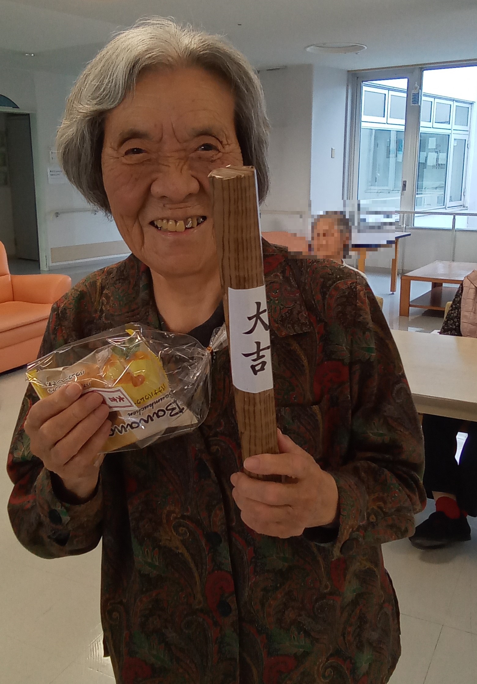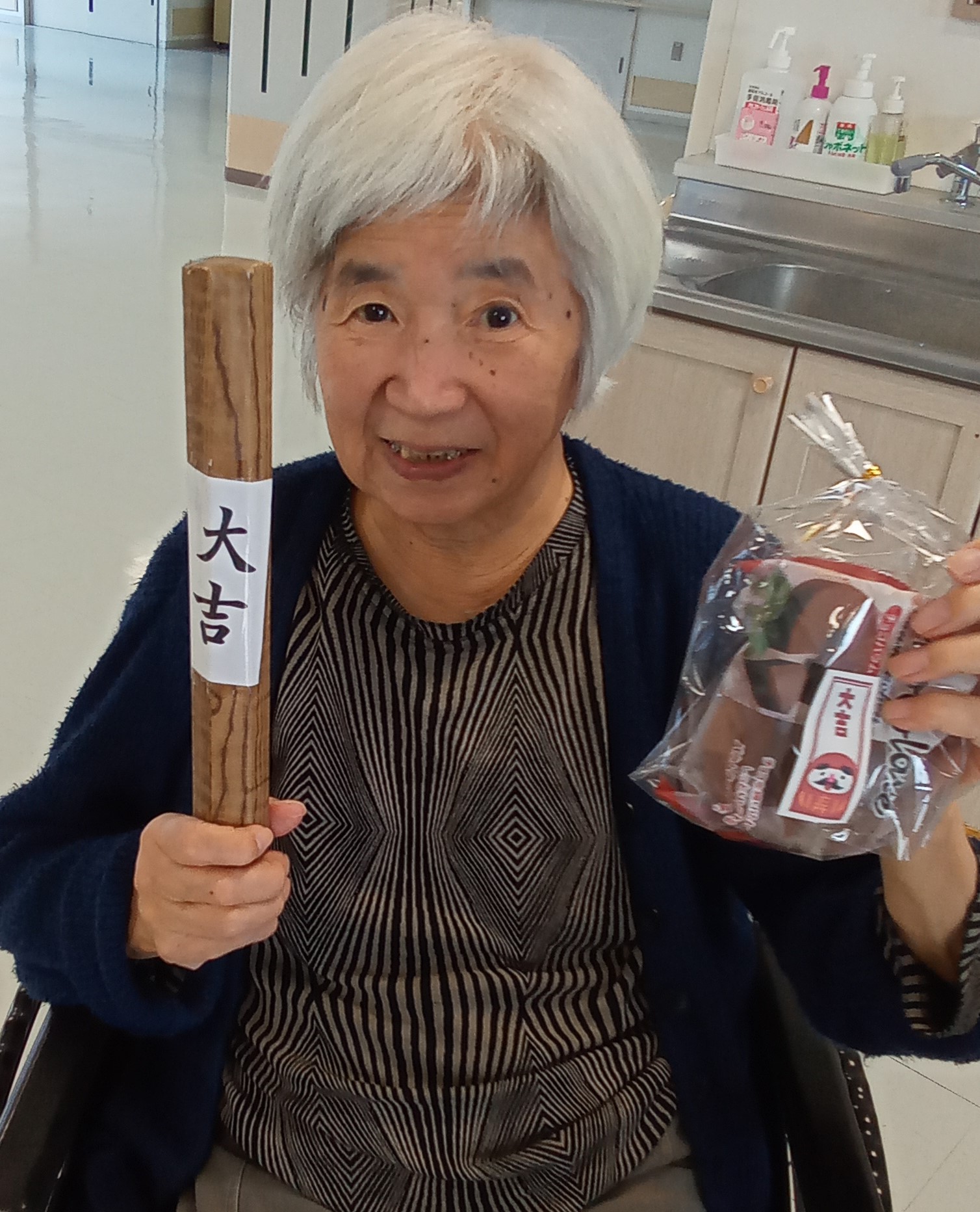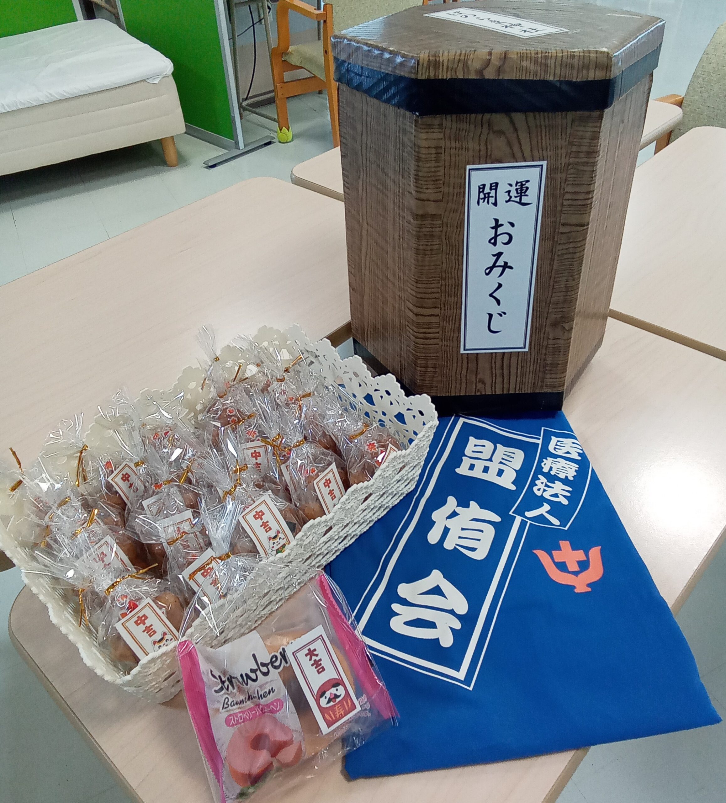 3階では毎年恒例となったおみくじでの運試しを行いました!皆さんにみくじ筒を振ってもらいました。おみくじの結果によってオマケのプレゼントも😊