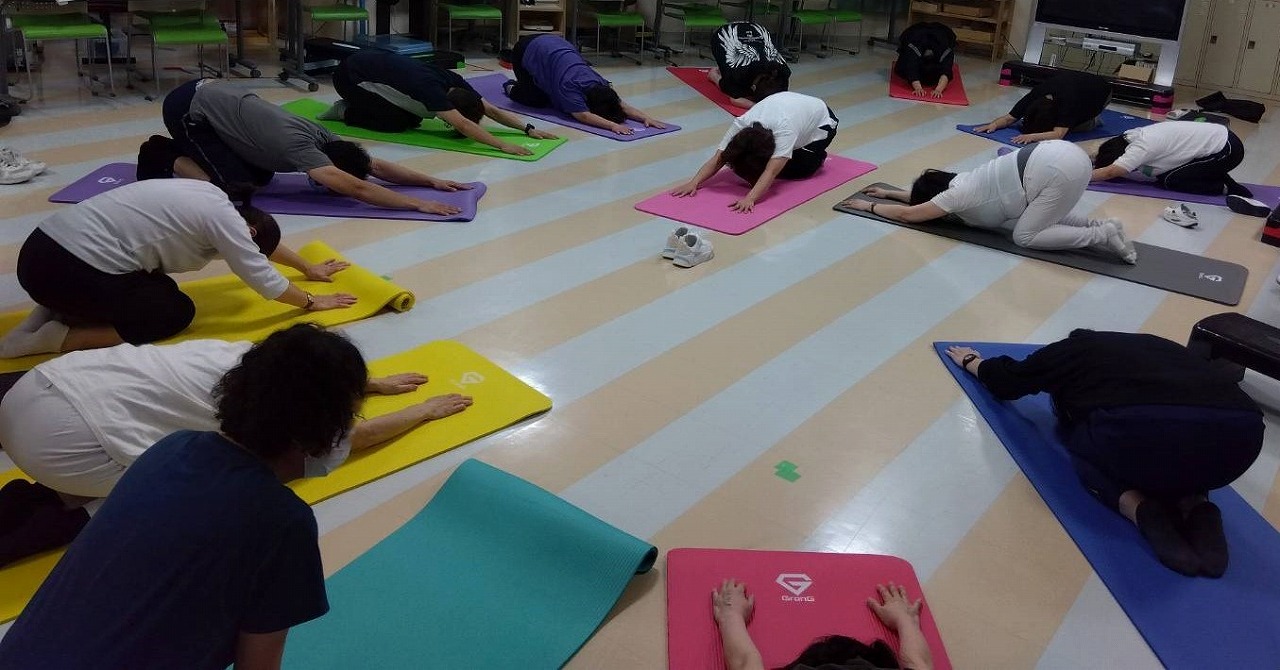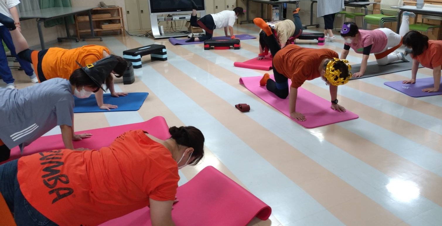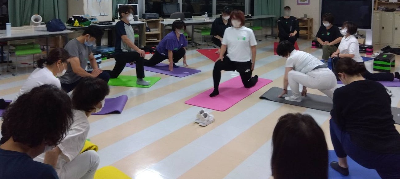 福利厚生の一環で、週に1回勤務終了後、踏み台を利用した有酸素運動やボクササイズに筋肉トレーニング、ストレッチと盛りだくさんの内容で、スタッフからのアドバイスを元に行っています。