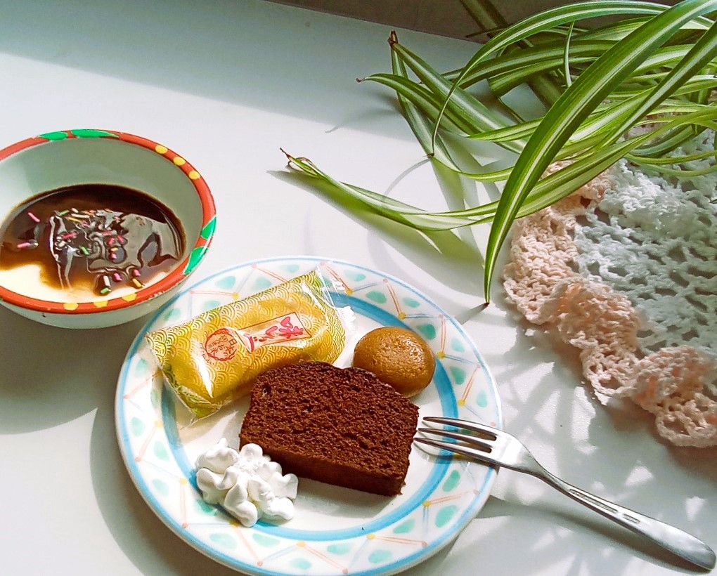 ココアのパウンドケーキと饅頭、プリンとせんべい。ちょっと茶色っぽいですが、皆さん美味しそうに召し上がられていました。