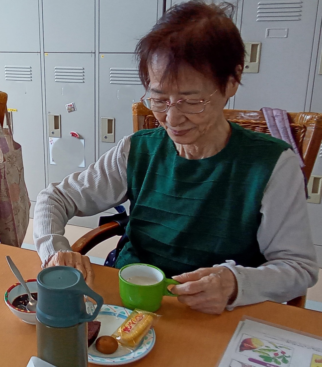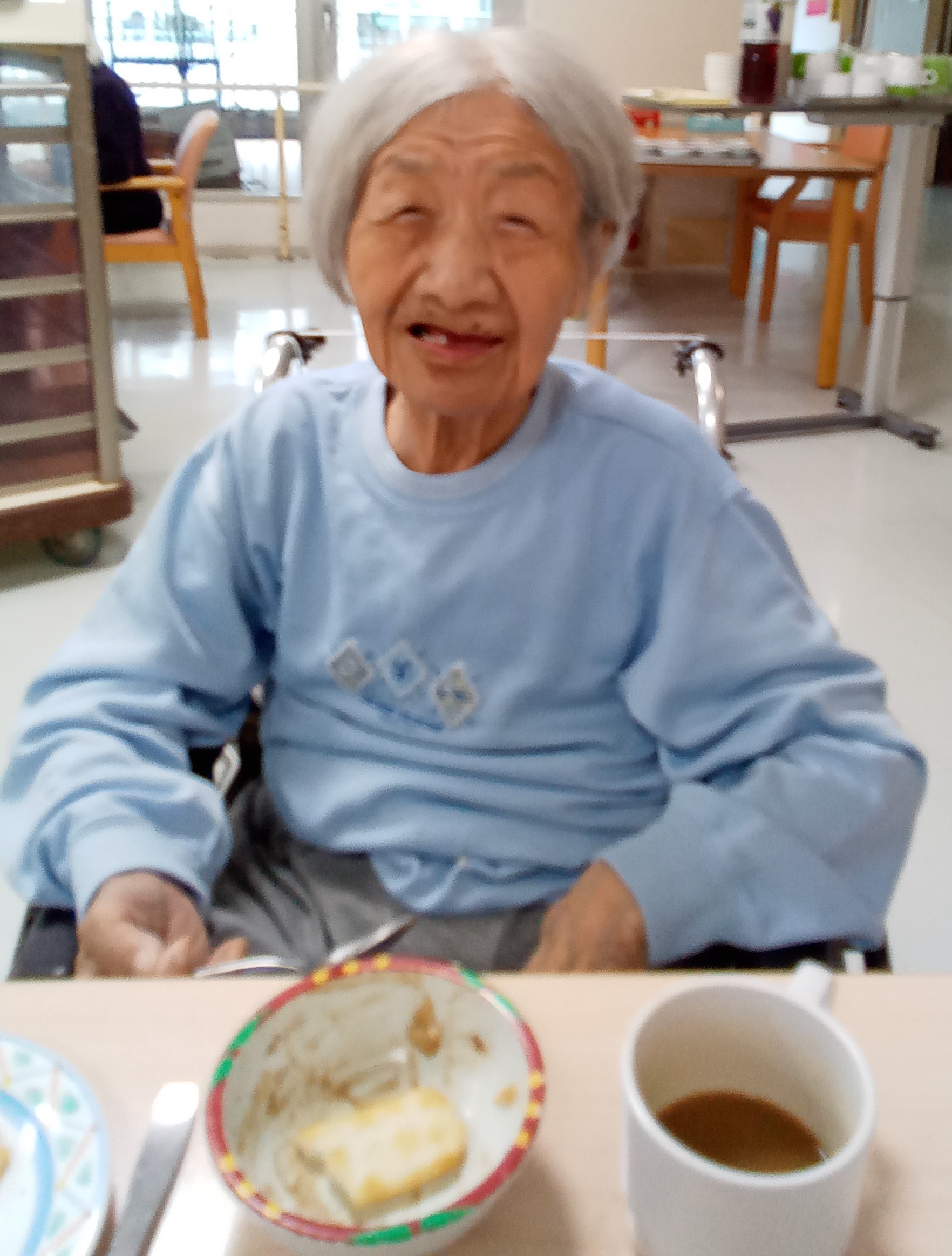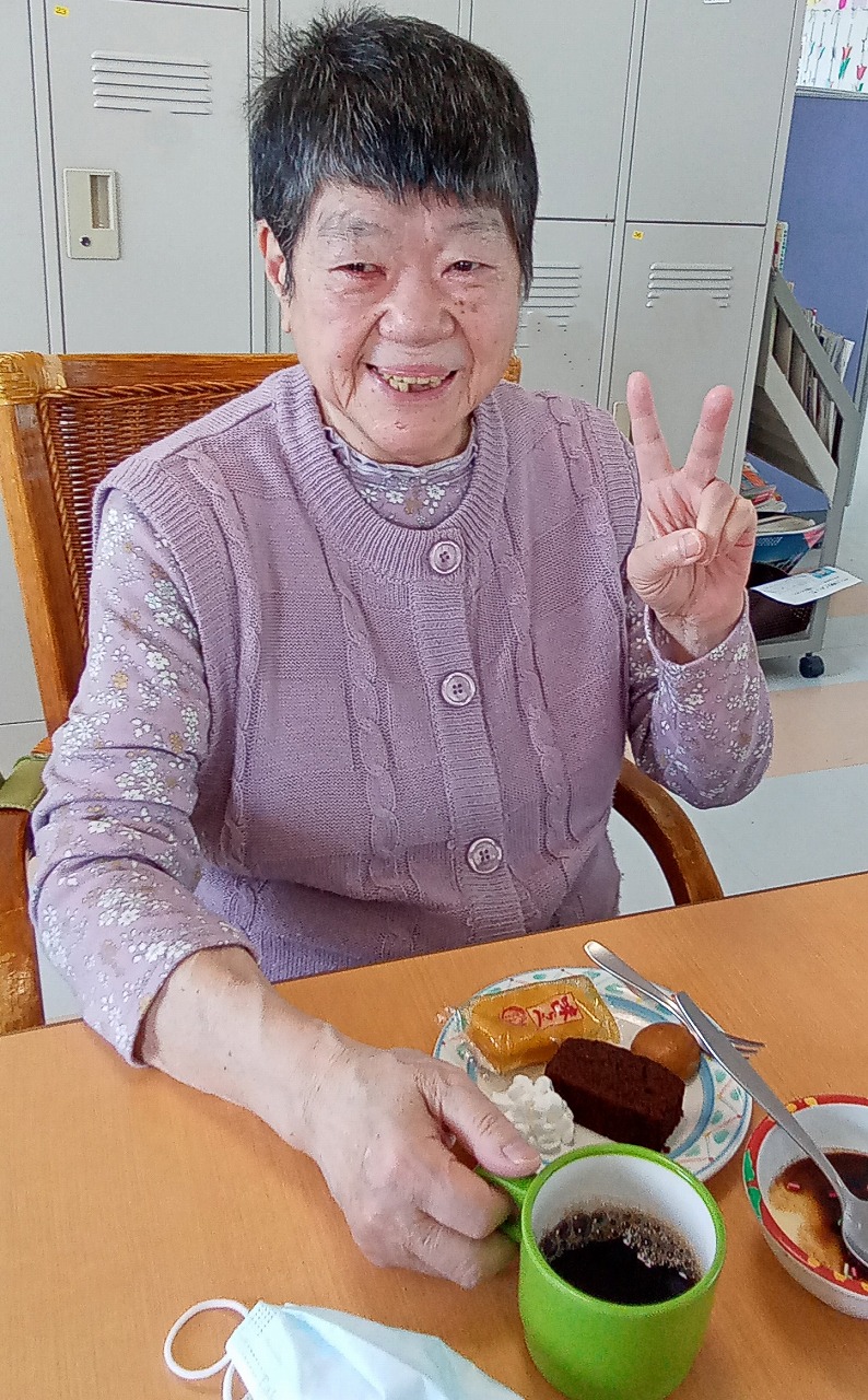 柔らかい日差しの中、間食時にデザート祭りを行いました。いつもよりちょっとだけ豪華なおやつと、お好みの飲み物で、施設版アフタヌーンティーといったところでしょうか❓