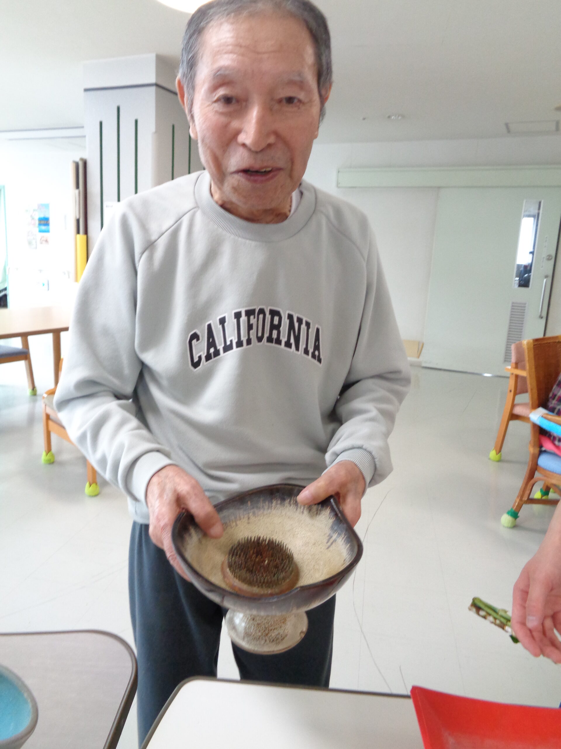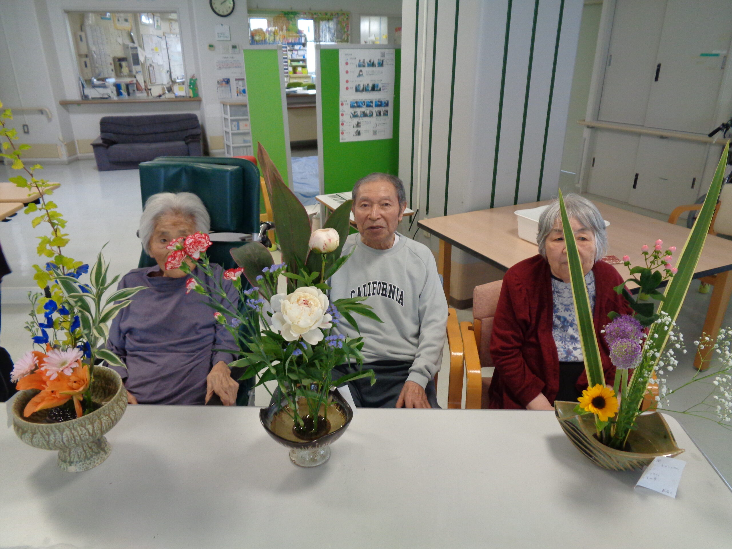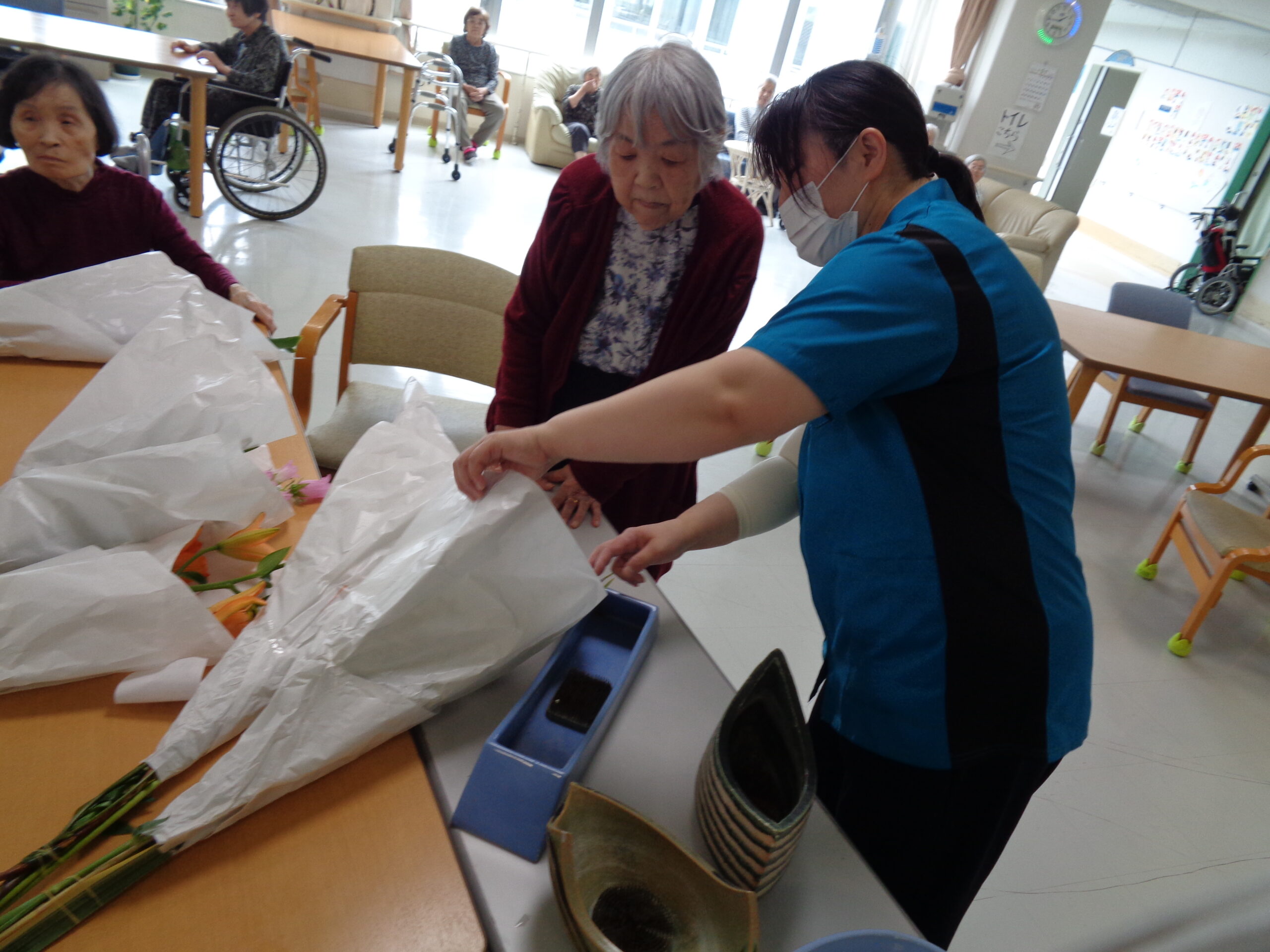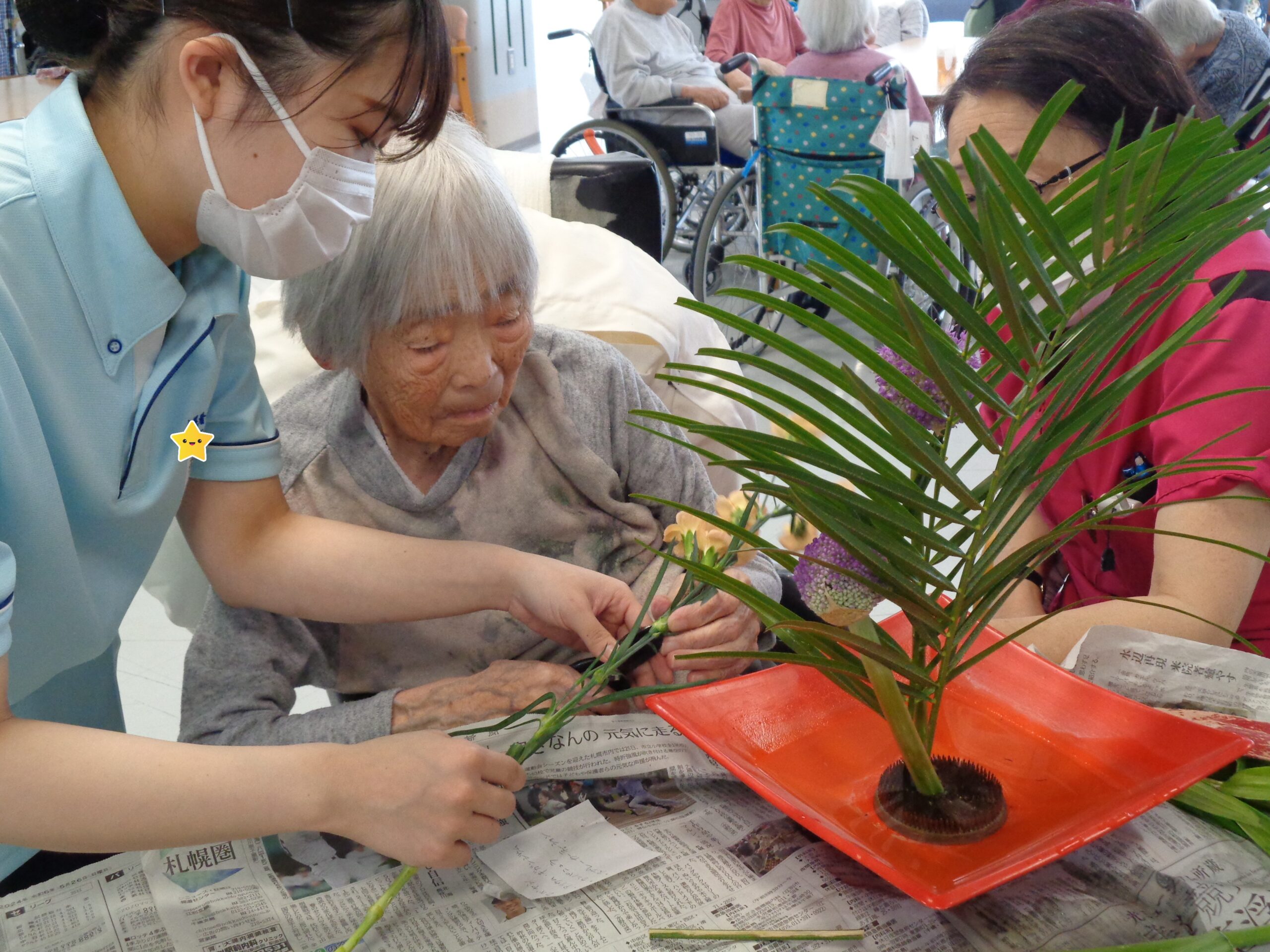 華道の先生に来て頂いて指導していただく事は叶いませんでしたが、利用者様には花を選んでいただき、垣も自分で選んでいただきました。一人一人が心穏やかに、かつ看護学生やリハスタッフ、職員と楽しく花を生け、有意義な時間をすごしていただけたんじゃないかと思います。