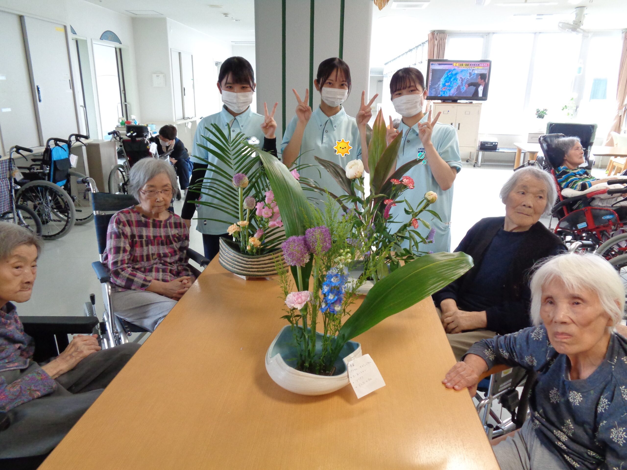 突然ですが・・・コロナが世に出回ってレクリエーション内容が変わり面会に制限がかかり外部の方との交流も減少したご時世でしたが、とうとう復活しましたレク活動:💐華道💐 花は華やかさはもちろん作品を通してさまざまなメッセージを伝えてくれます。今回は実習中の若~い看護学生と人生の先輩である利用者様と一緒にわいわい楽しい時間を過ごしたのでお伝えします。