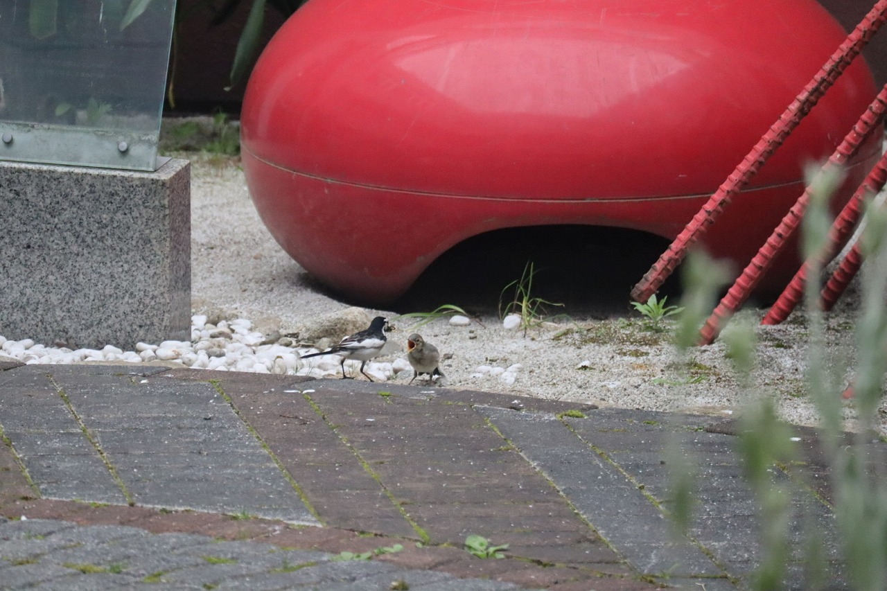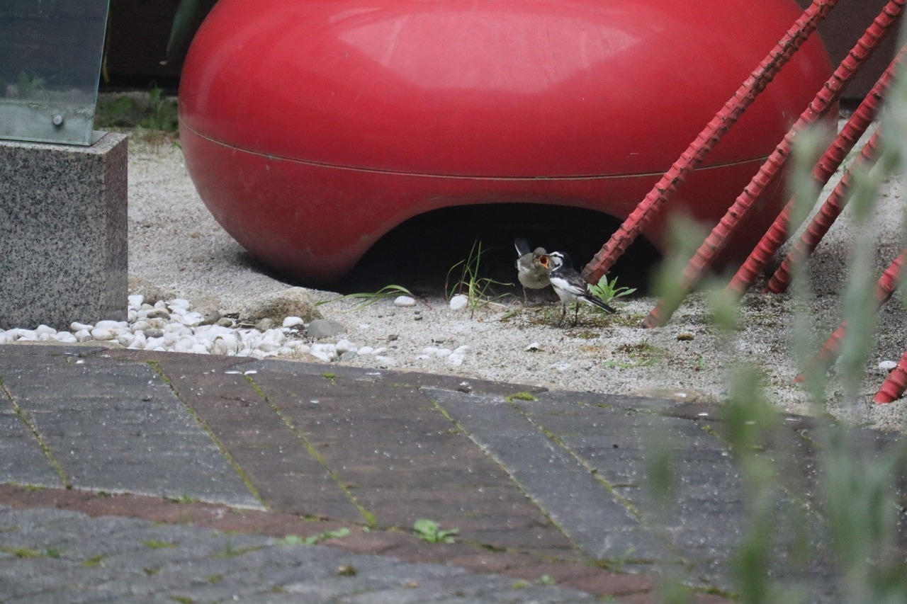 中庭の赤いドーム状の中に巣があるのですが、雛鳥は親鳥が近くにいない時はその中に隠れていて、親鳥がごはんを運んでくると勢いよく出てきて、口渡しでごはんをもらい「ピピピピィ」と嬉しいのか大きな声で鳴きます。その姿は本当に微笑ましくて、心が癒されます(^^)
