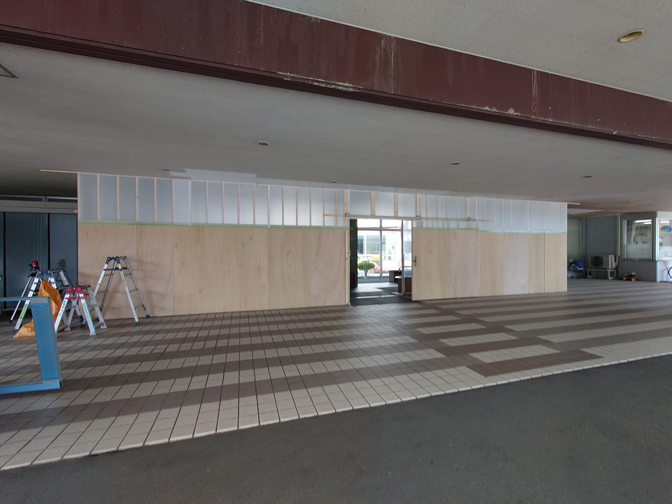 今月7月1日より工事が開始され、工事内容は正面玄関部分のアルミサッシの交換及び自動ドアの更新を実施しました。写真の様に仮説ドア(木造の養生、ドア立派に見えませんか?)を設置し、約3週間ほどで全工程を終了し完成しました。自動ドアを3箇所リニューアルしたのですがさすが新品の自動ドアですね~、モーターの音がとても静かになり開閉もスムーズ(個人の見解です)。