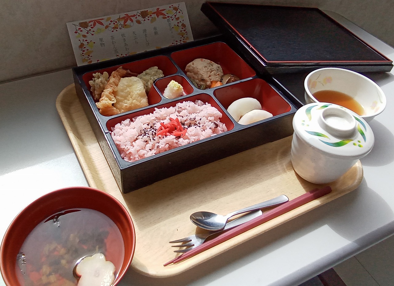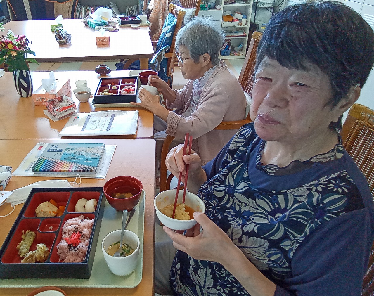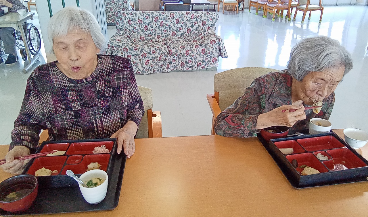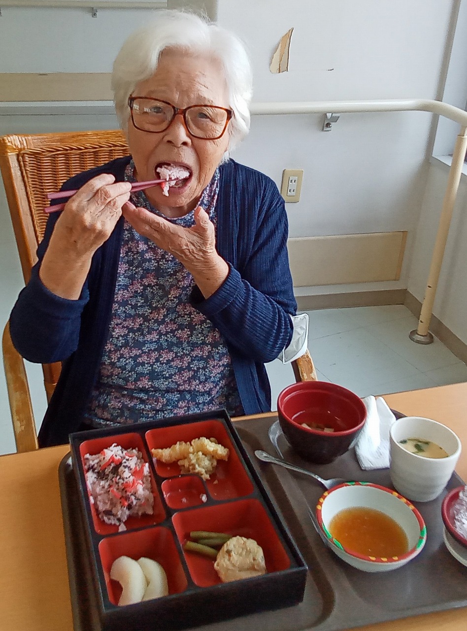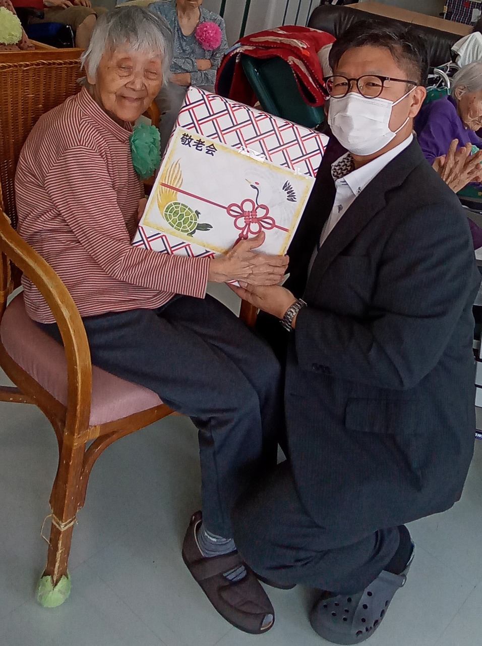 昼食時にはお祝い膳を頂き、利用者様へ感謝の気持ちを込めて、プレゼントをお渡し、御家族からの温かいお手紙と事務次長からのご挨拶にて入所者様への日頃の感謝と長寿をお祝いしました。