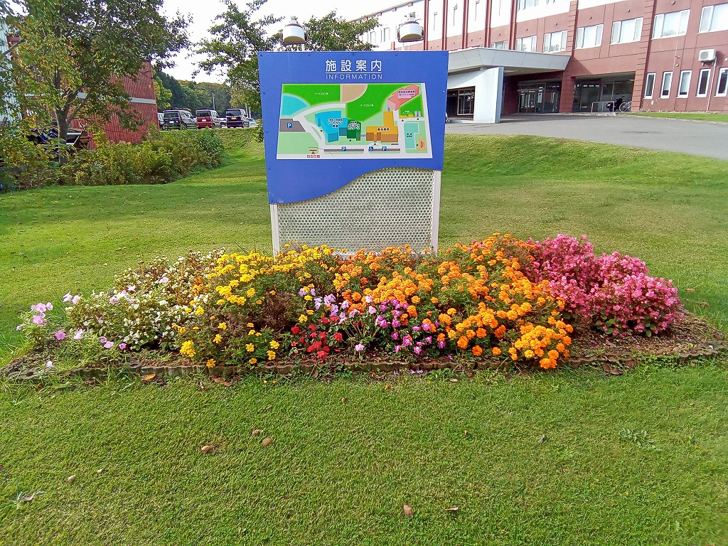 タイトルの「まだまだ元気です!!」ですが、アートライフ恵庭で春先に植えた花たちが今年はまだまだ元気に咲いているのです。一部終わった花もあるのですが、中庭、入口看板前と咲き乱れているのです。
