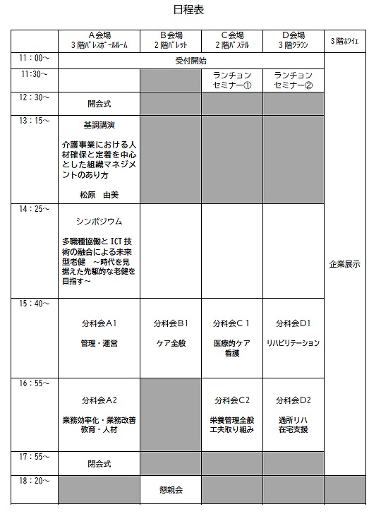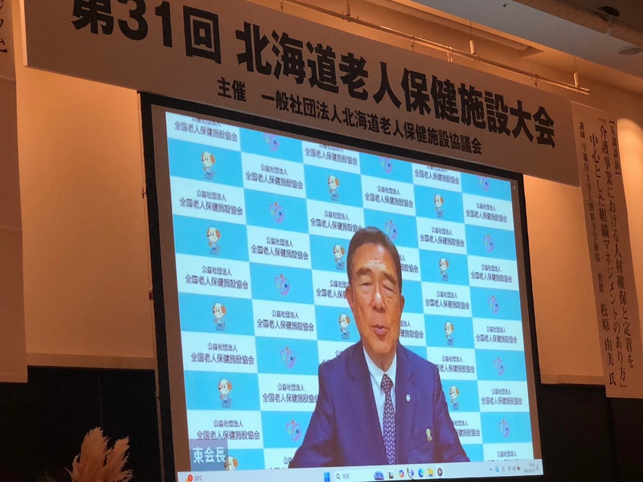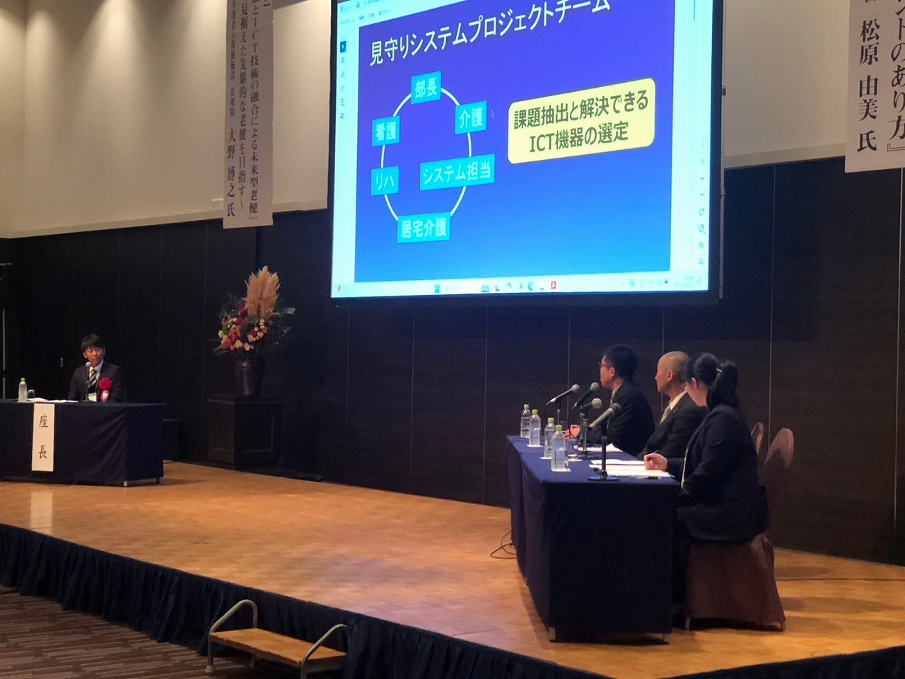 基調講演では、『介護事業における人材確保と定着を中心とした組織マネジメントのあり方』をテーマに「早稲田大学人間科学学術院 松原 由美 氏」が、ご講演いただき、シンポジウムでは、大会テーマである『多職種協働とICT技術の融合による未来型老健』をもとに道内3施設のICT活用状況や外国人労働者本人による労働者の立場、生産性向上に関わる取り組みなどが報告されました。会場からの質疑がまた盛り上がりを活性化していました。
