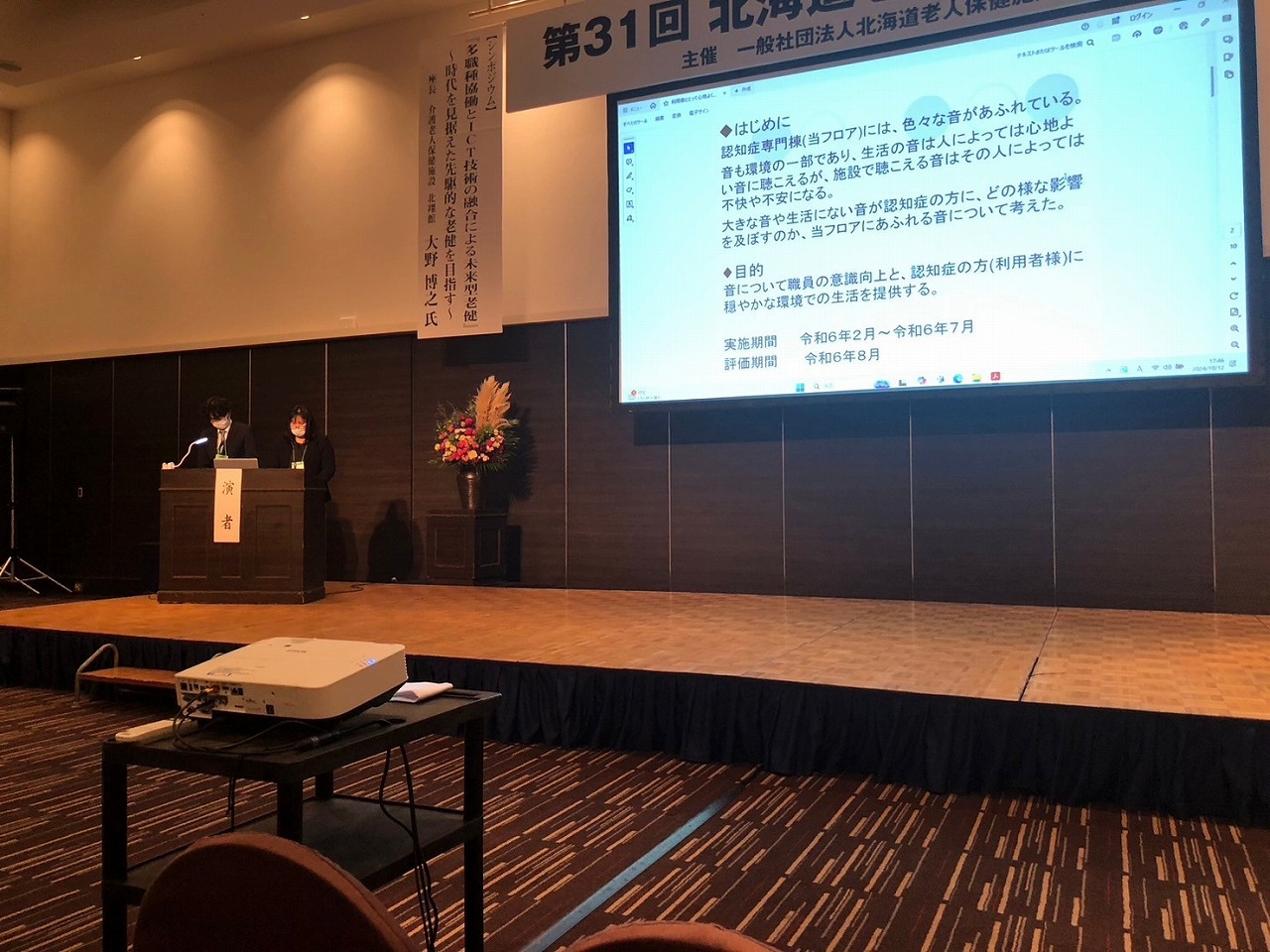 各分科会会場では当施設による取り組みとして『音について ~職員の向上と環境整備を図る』と題した発表をいたしました。認知症専門棟の介護職員が施設での生活音は一般家庭の生活音とは違うことに焦点を当てて発表しております。発表も堂々としっかりと発表しており、分科会終了後には、他施設から直接、質問を受けるなど高評価でした\(^o^)/
