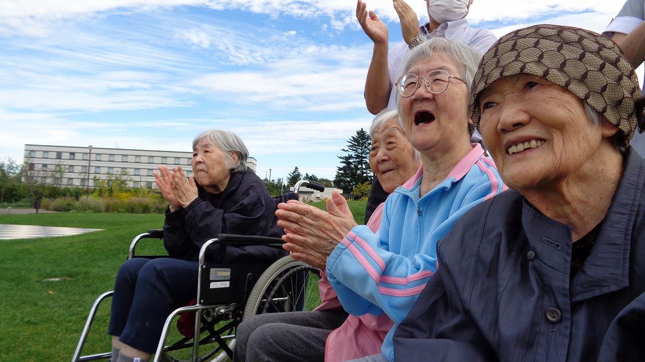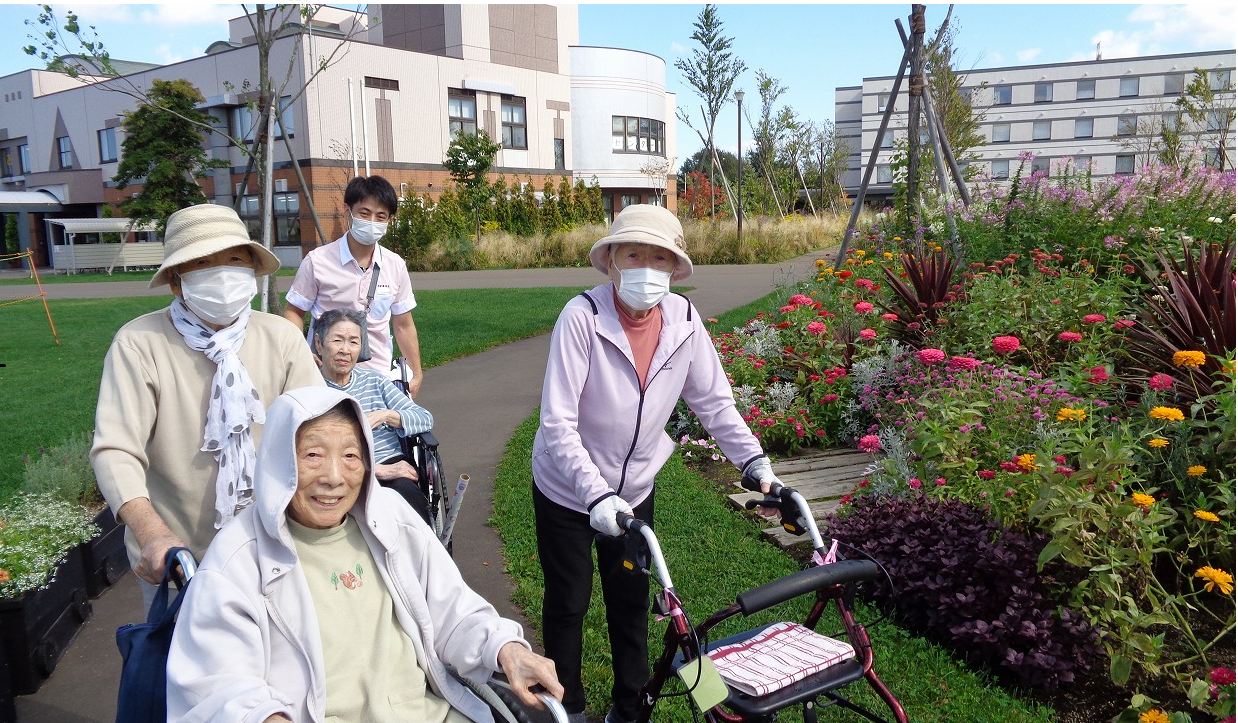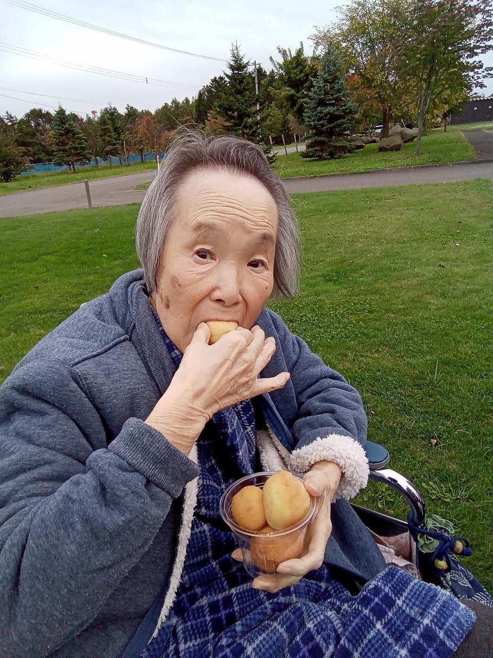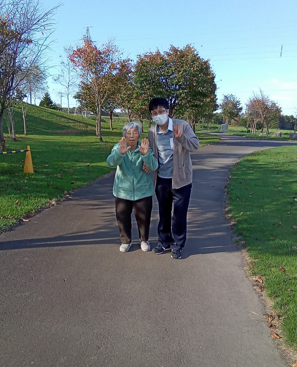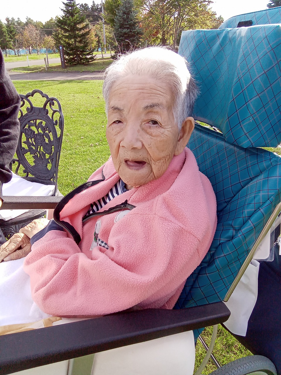 恵庭の道の駅では、たくさんの花壇を見て回り、「まだまだ歩けるよ!」と、広い園内を元気に歩かれていました。休憩用に用意した車椅子は出番なしでした💦