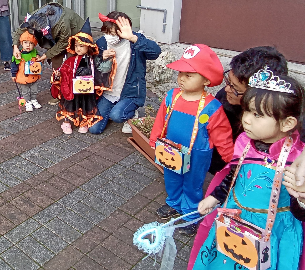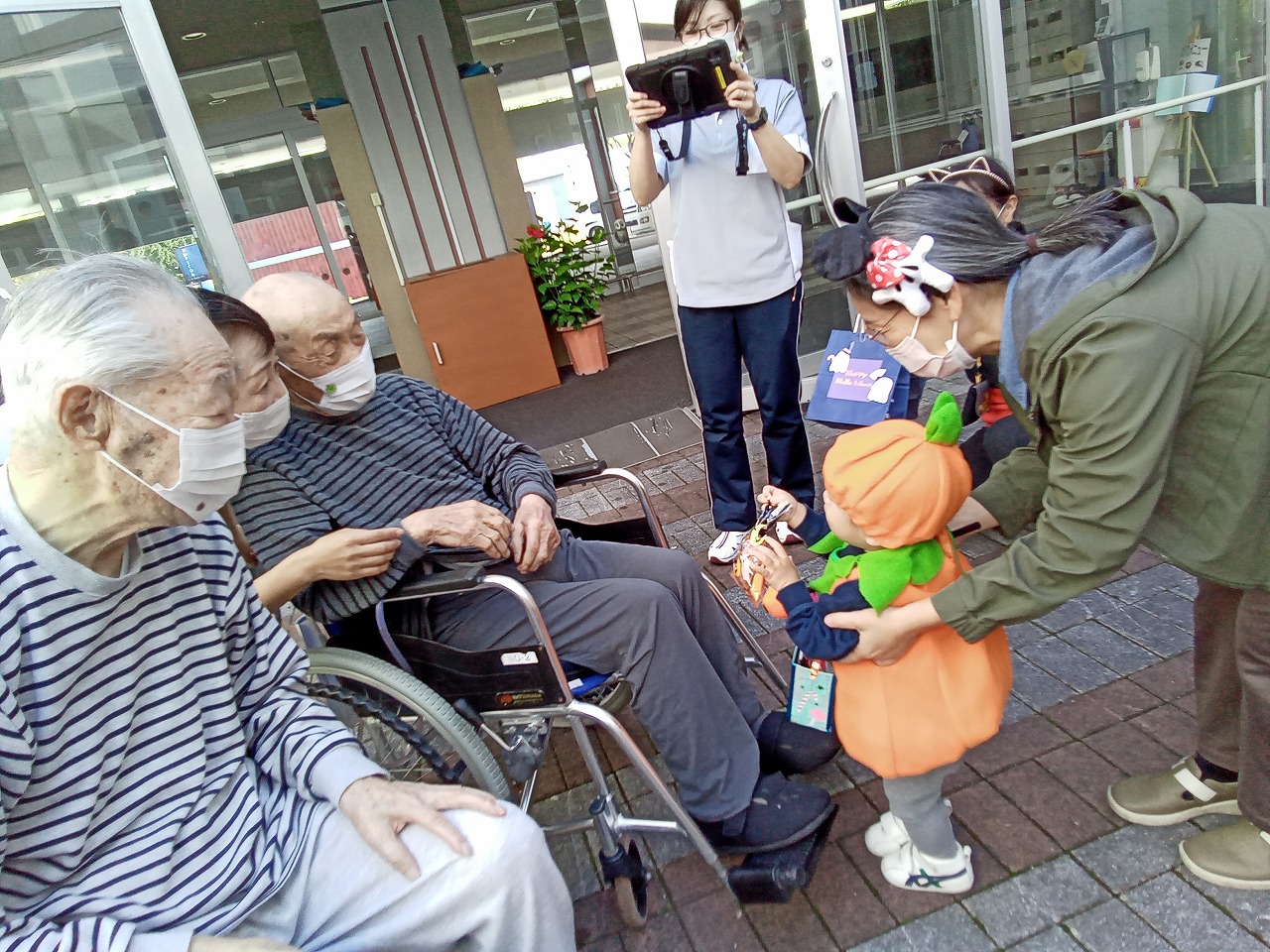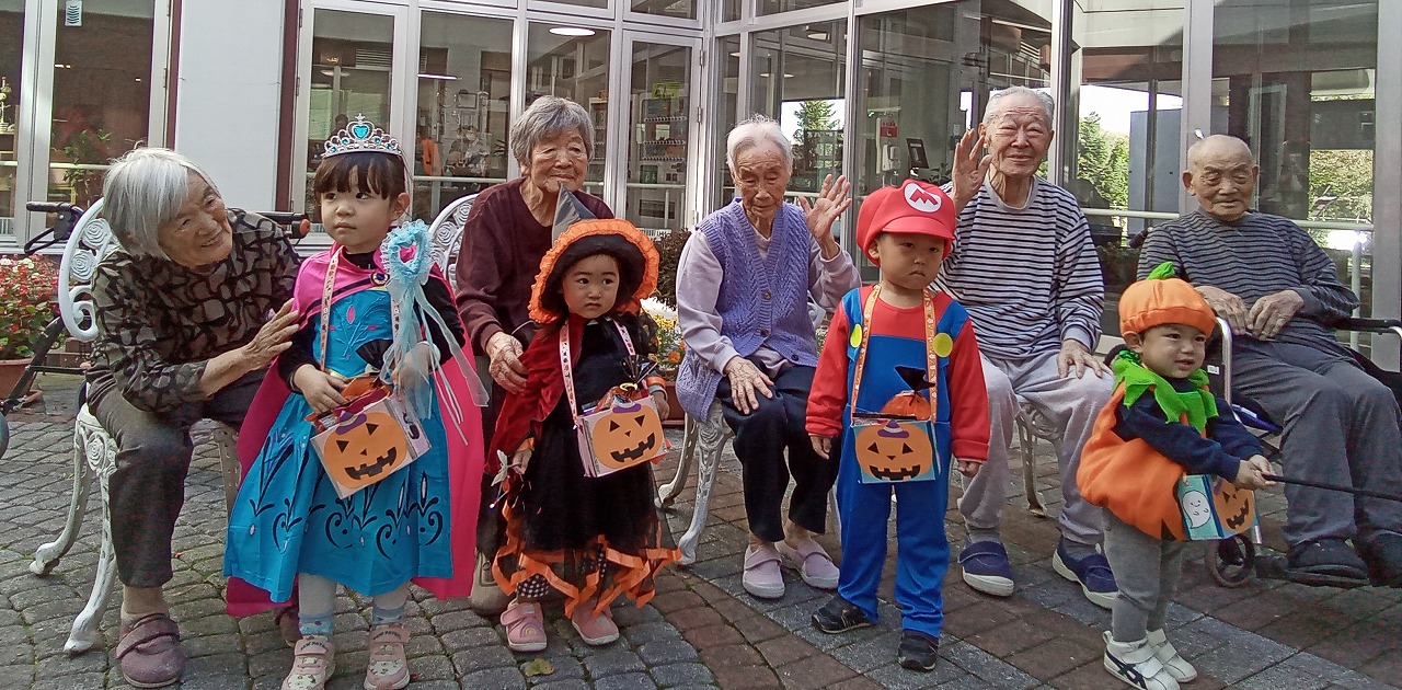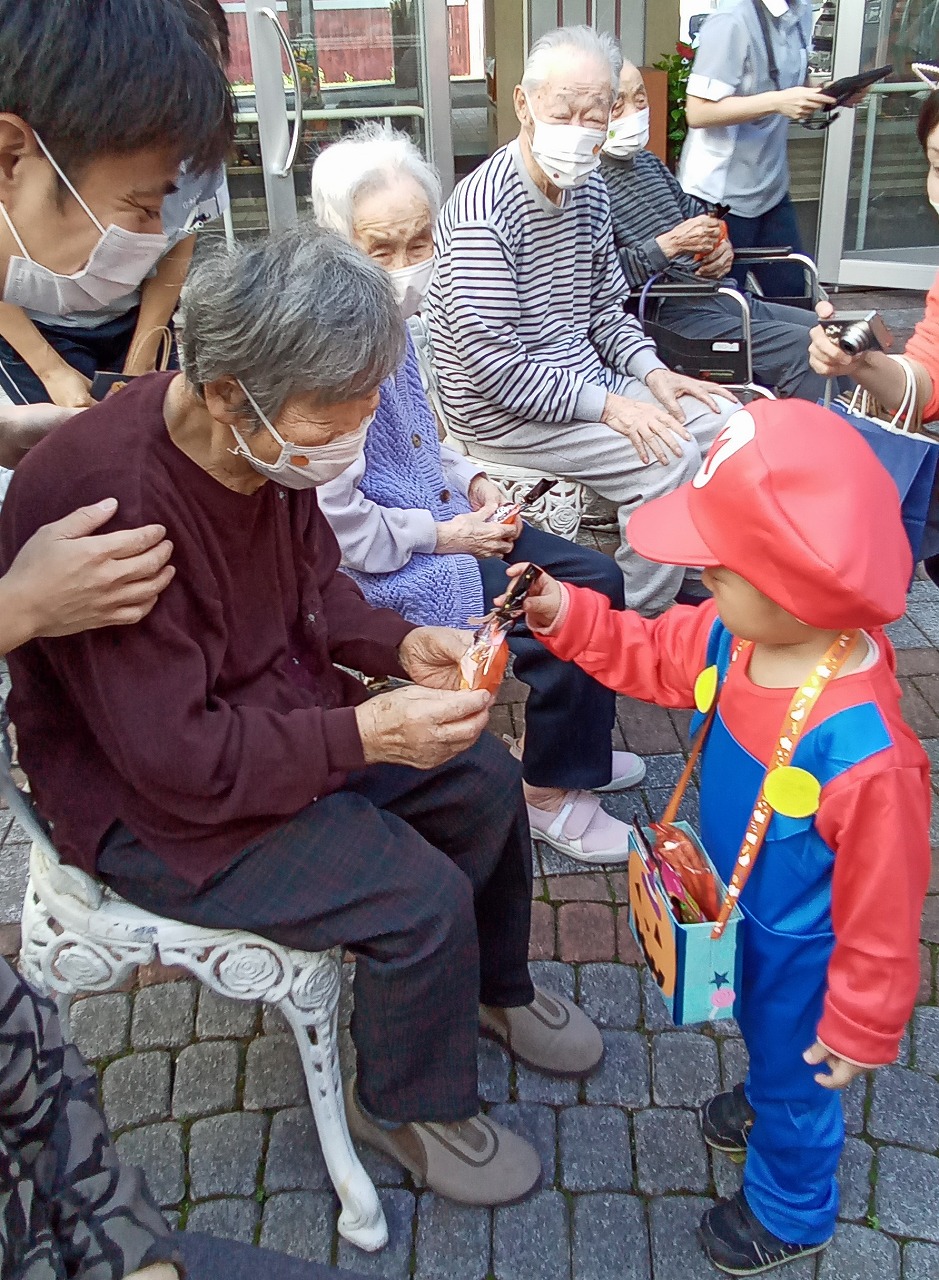 ちょっと前のブログでnono氏も話されていたように、ハロウインはお年寄りにはなじみの薄いイベントですが、マリオや、プリンセスと可愛く変身した子供たちのあどけない笑顔と「トリックオアトリート」と唱える姿に、あっという間に魔法をかけられ、終始目じりが下がりっぱなしの利用者様と職員でした。