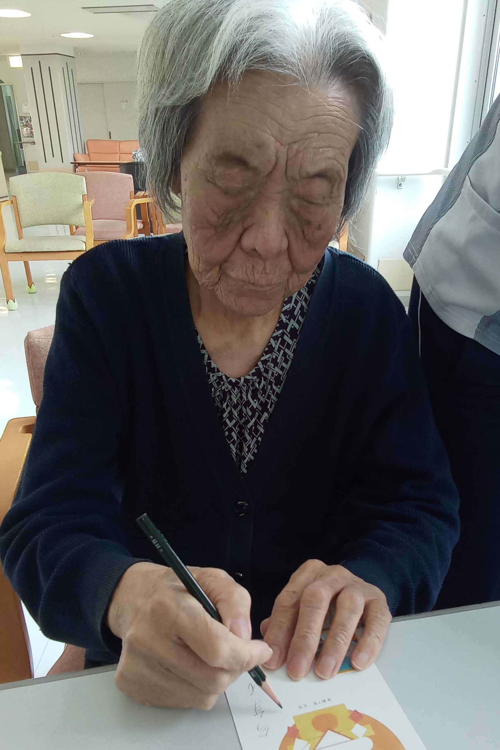 毎年リハビリの一環で利用者の皆さんに年賀状を書いてもらっています。皆さん、思い思いの文書を考え一生懸命書いてくれました。