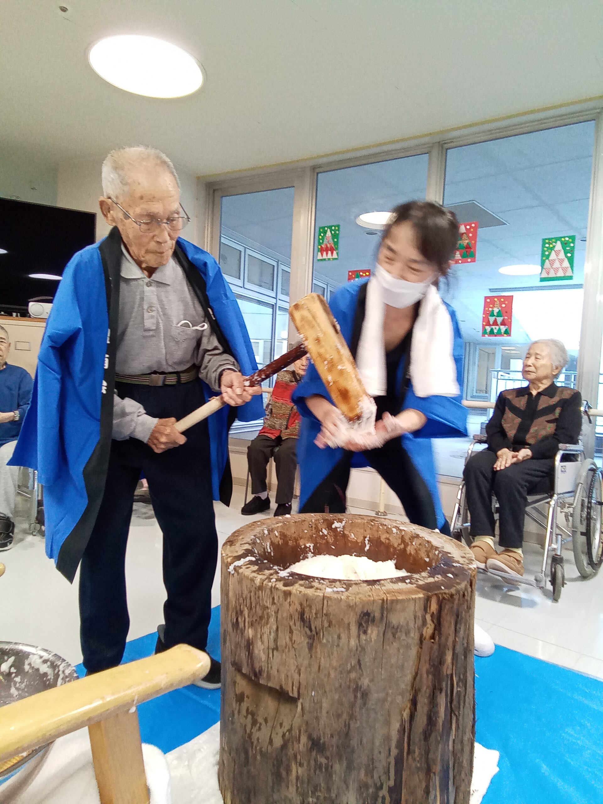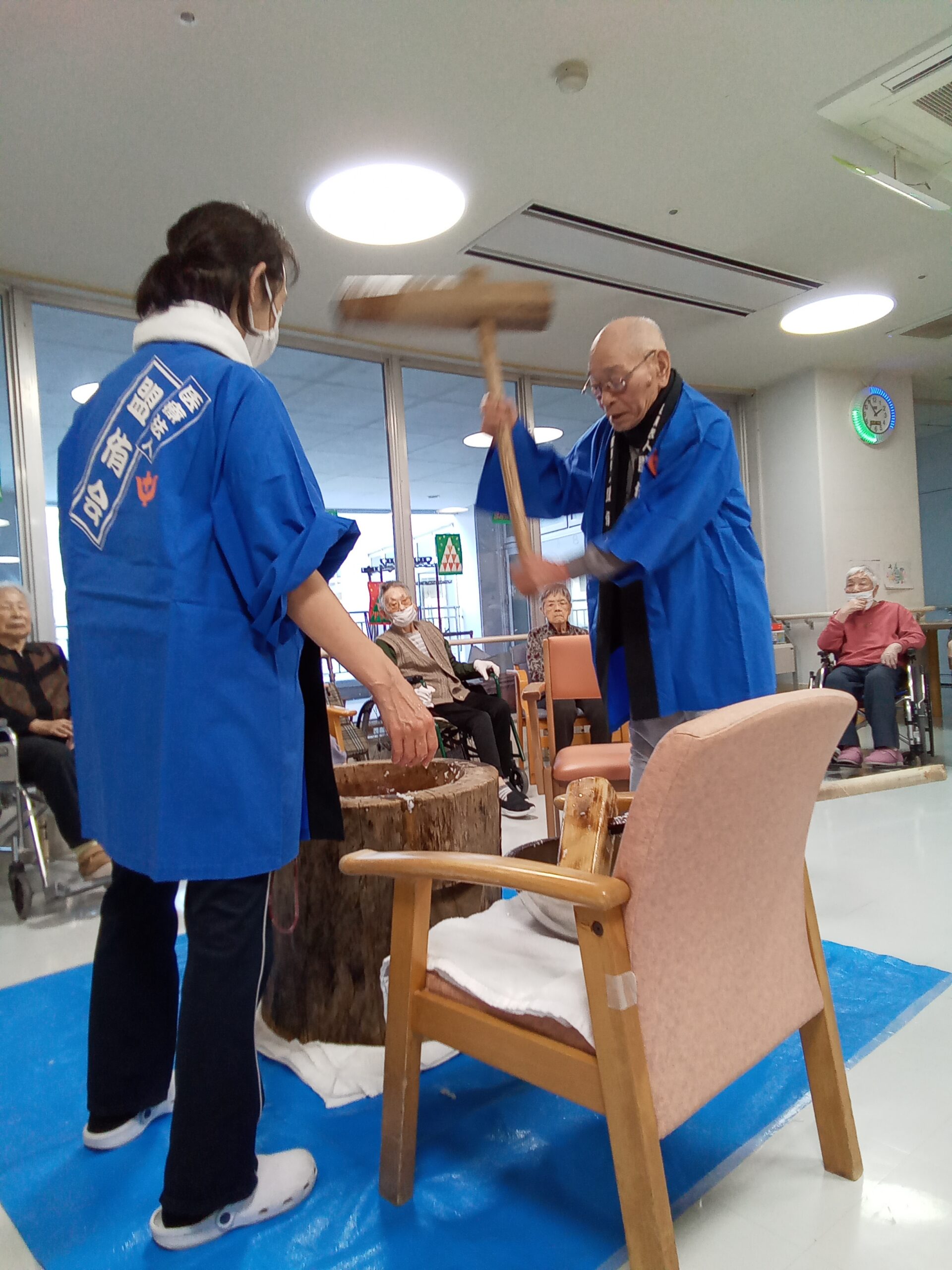 クリスタルフロアでは、100歳越えの方も数名いらっしゃいますが、皆さん、力いっぱい杵を振り上げて餅つきしていました!