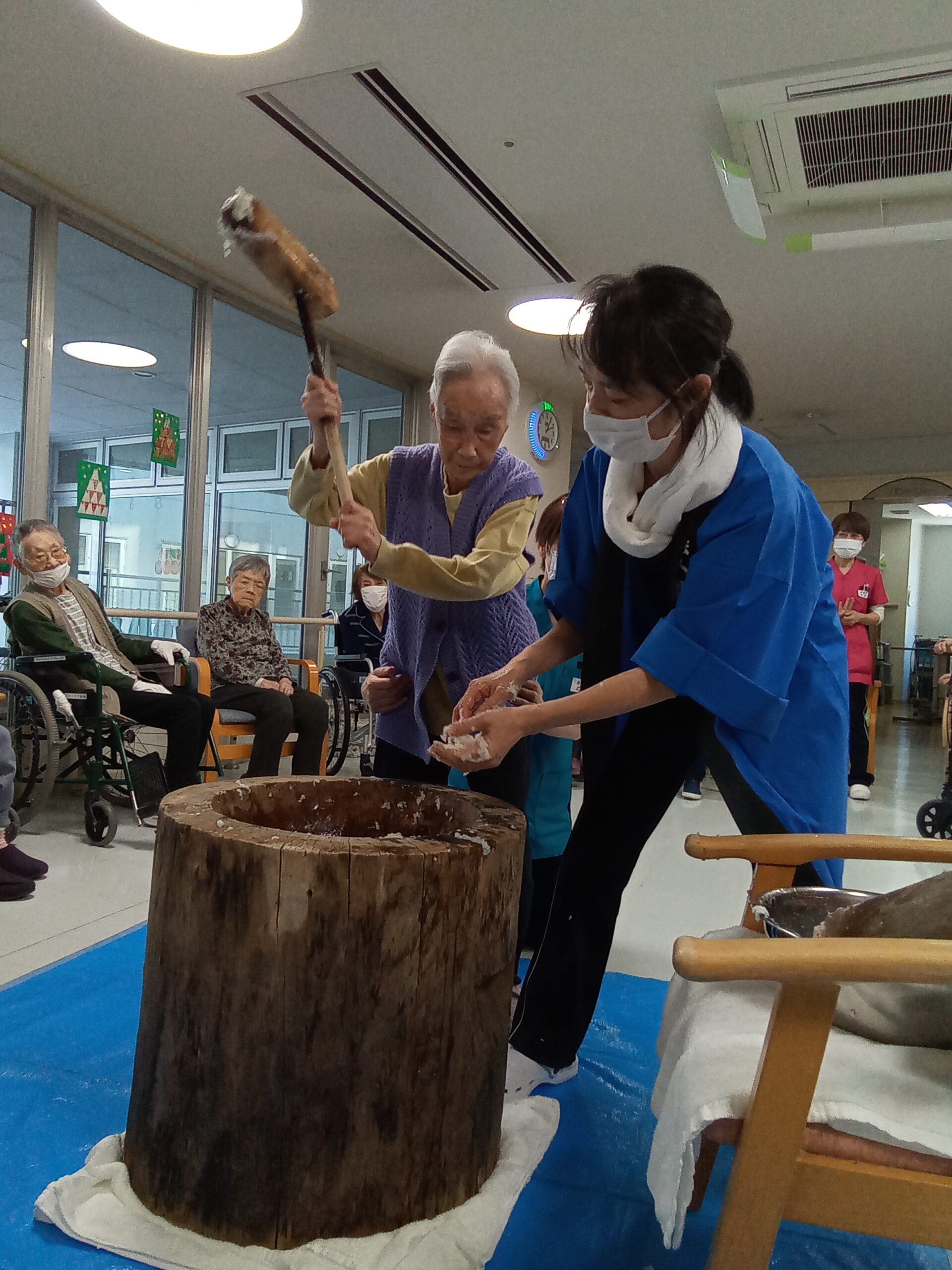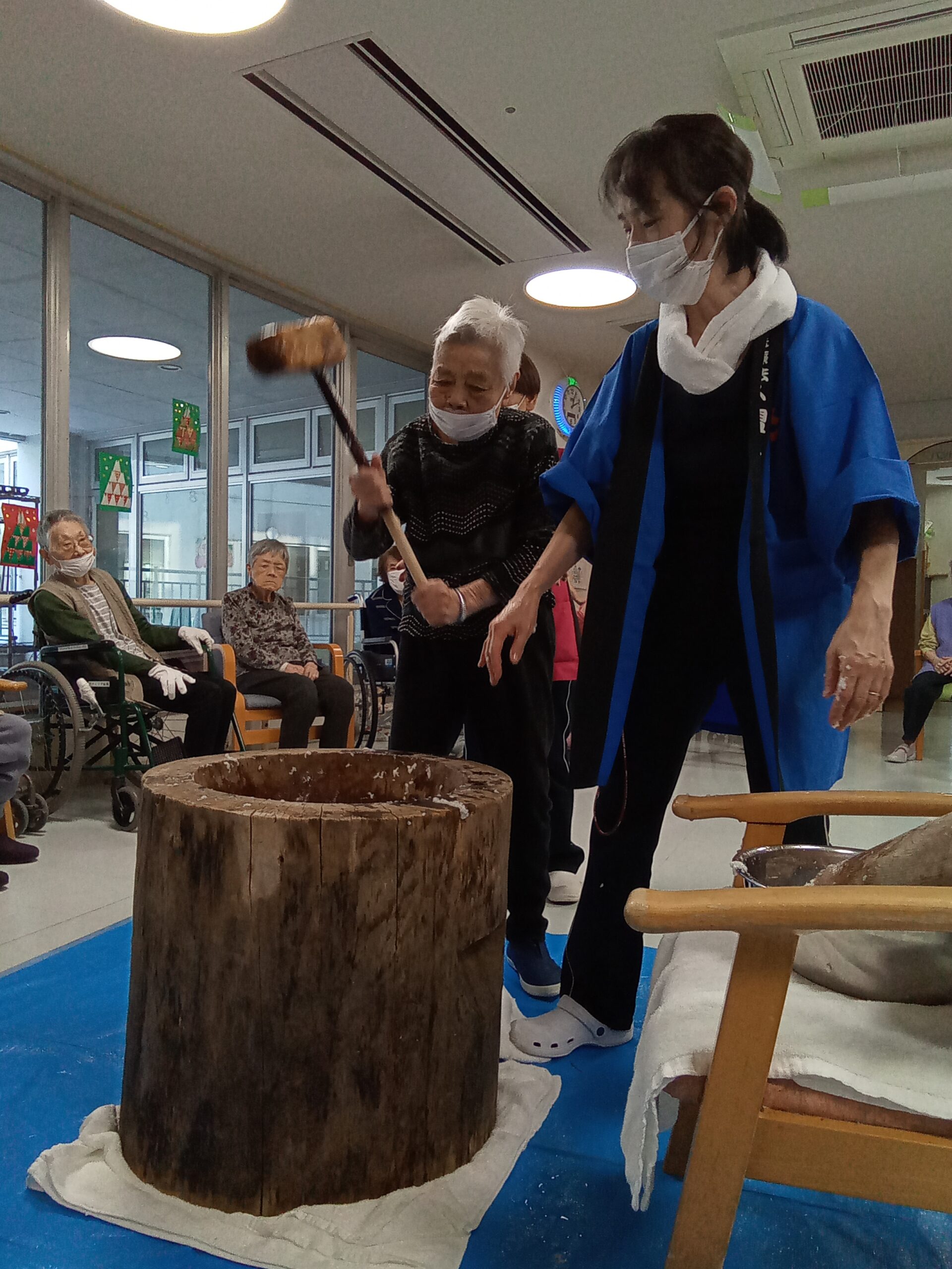 車いすの方もスタッフに手伝ってもらいながら餅つきを楽しんでいらっしゃいました(*^^*)