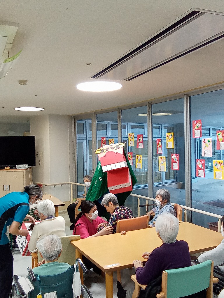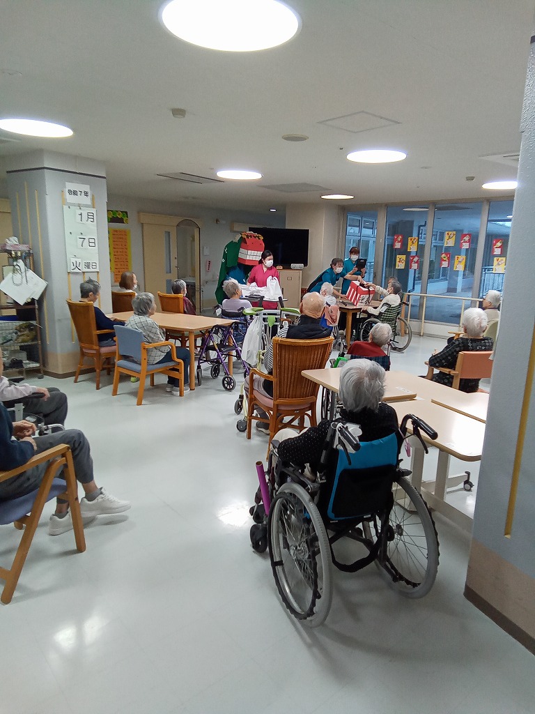 コロナ前には、ご利用されている皆さんが1階のフロアに集まりお祝いしておりました。しかし、昨今のコロナやインフルエンザなど、感染性の予防対策のため、現在は各階ごとに行うスタイルへ変わっていきました。今回は先日行われました『新年娯楽会』の様子をお伝えします。