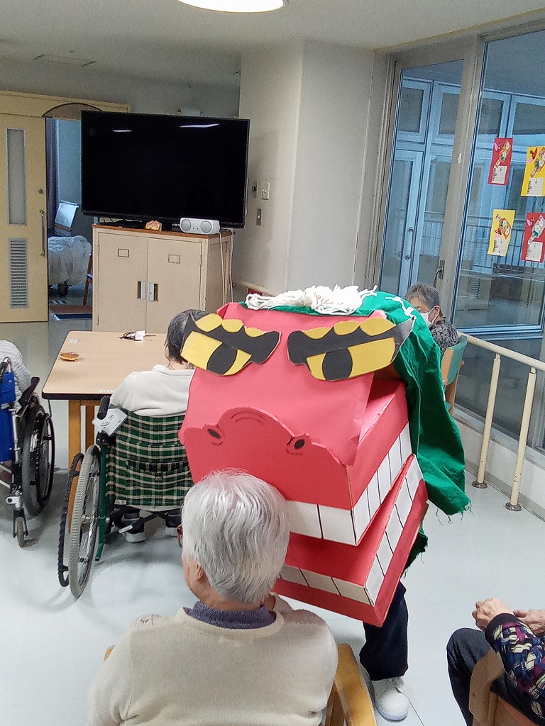 各フロアでは、新年を祝って、皆さんにおみくじを引いていただき、正月の雰囲気を味わっていただきました。また、職員が丹精込めて作成した手作りの獅子舞で、フロアも練り歩きました。