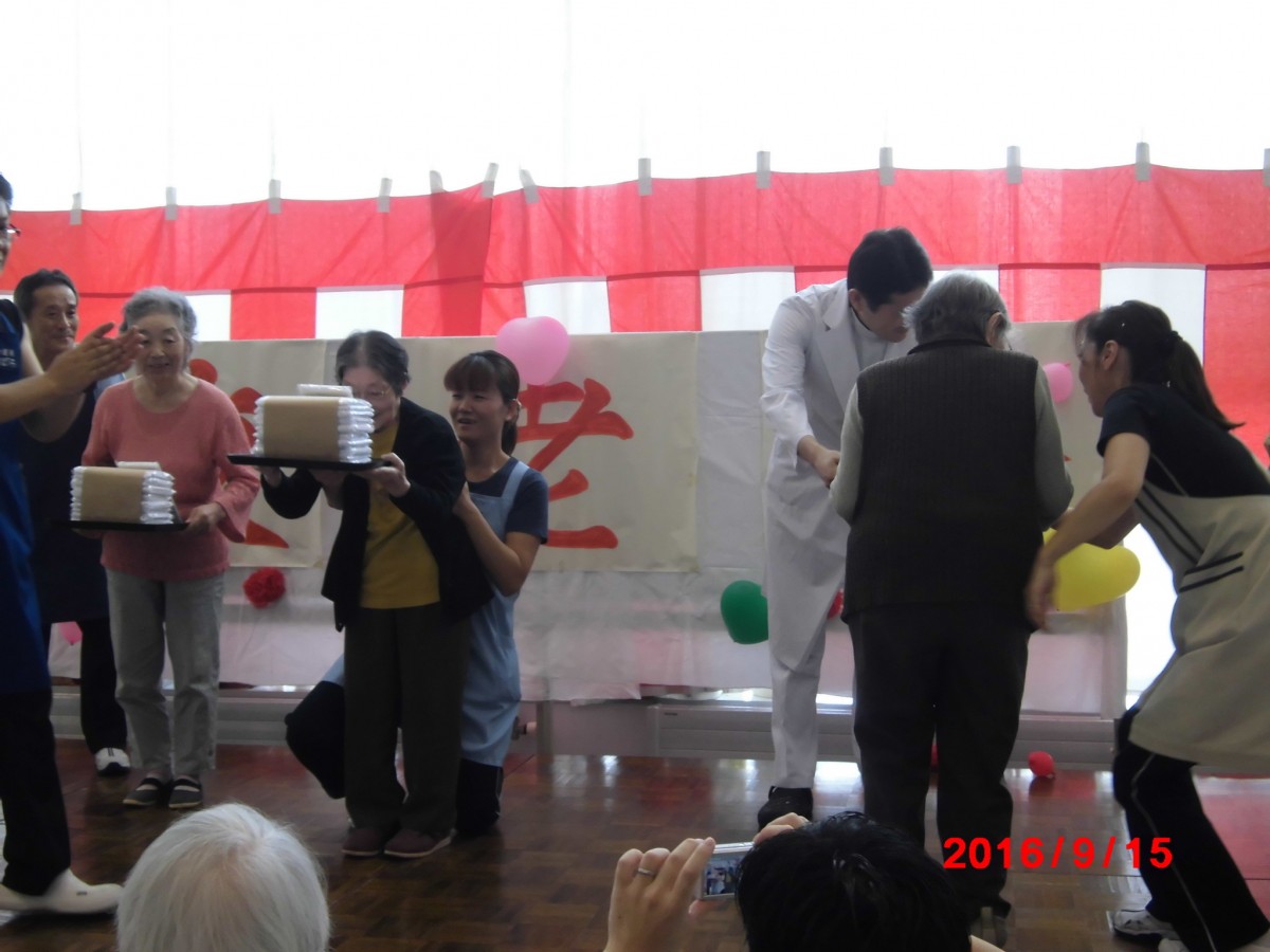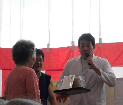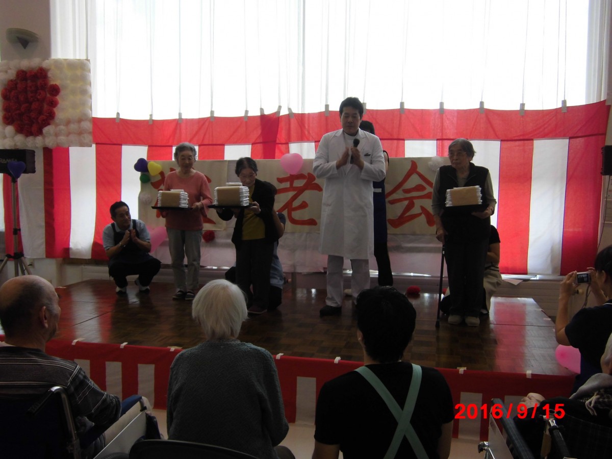 敬老会のようす 掲載日:2016.09.16 9月15日(木)に当施設の行事として、敬老会を行いました。 今年は、開設20周年を記念して、アートライフ恵庭オリジナルの「フェイスタオル」を作成しました。 記念品贈呈の風景を掲載しますね(#^^#) 皆さん、良い笑顔ですね。 敬老会の中では、エルム幼稚舎から小さな子供たち(4歳~5歳)が、遊びに来てくれ、何とエイサー太鼓や歌を披露してくれました。 エルム幼稚舎の皆さ~ん、ありがとうございました。<(_ _)>