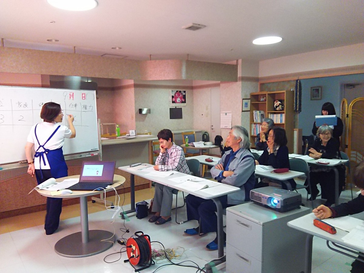 1枚目の写真では、高齢者との関わりや認知症などについて、スライドやホワイトボードを使用した講義の風景です。