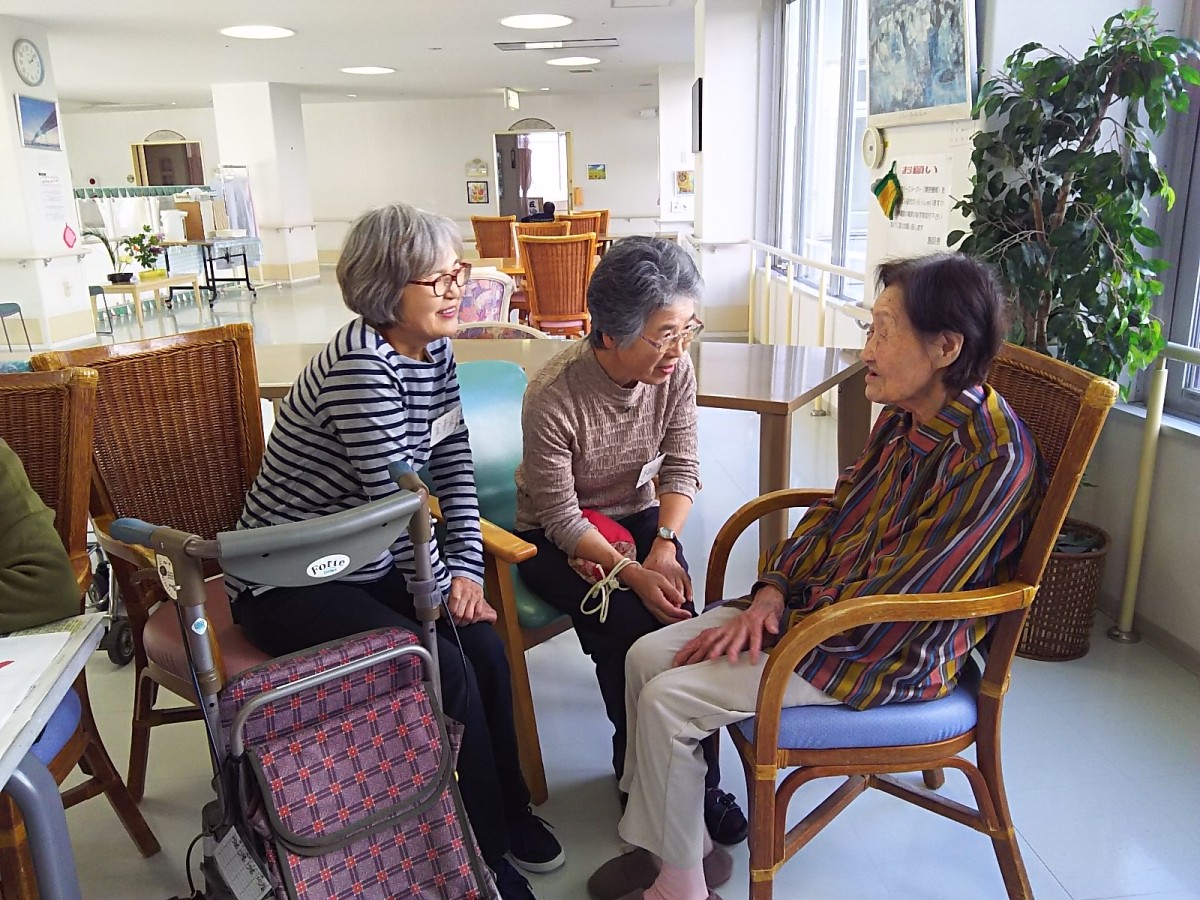 3枚目は、実践の場面です。当施設の利用者さんのお話しを傾聴していただいています。なかなか素敵な写真ですよねぇ。つい掲載してしまいました。