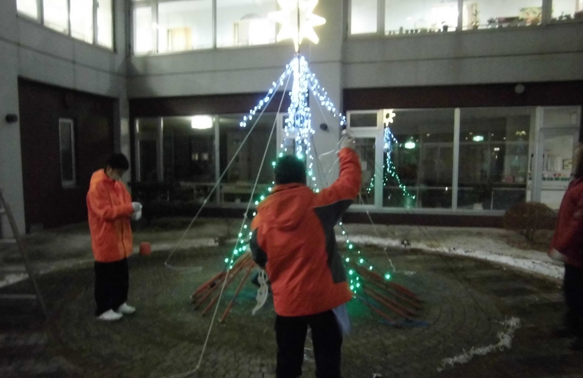 11/29(火)~11/30(水)にかけて中庭に毎年恒例のイルミネーションの設営を環境美化整備委員会のイケメン(?)男衆4人で作業を行いました。