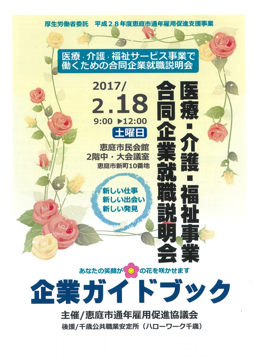 一昨日の2月18日(土)に恵庭市通年雇用促進協議会主催の『医療・介護・福祉事業 合同企業就職説明会』へ参加してきました。