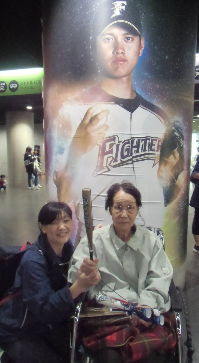 大谷選手の巨大ポスターの前で早速、記念撮影をし緊張の趣のまま試合会場へ。