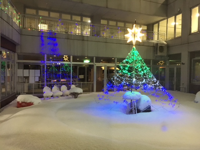 皆様からは大きな歓声があがり作成にたずさわった委員も報われる瞬間でした。ちなみに点灯時間は午後3時半よりですので、皆様ぜひお越しの際はご観賞してください。観賞ポイントは窓に映るツリーです。