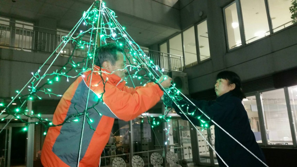 11/15(水)、11/24(金)、11/27(月)の3日かけて中庭に毎年恒例のイルミネーションの設営を環境美化整備委員会のイケメン(?)男衆3人と今年より加入した新人委員の美女1人で作業を行いました。