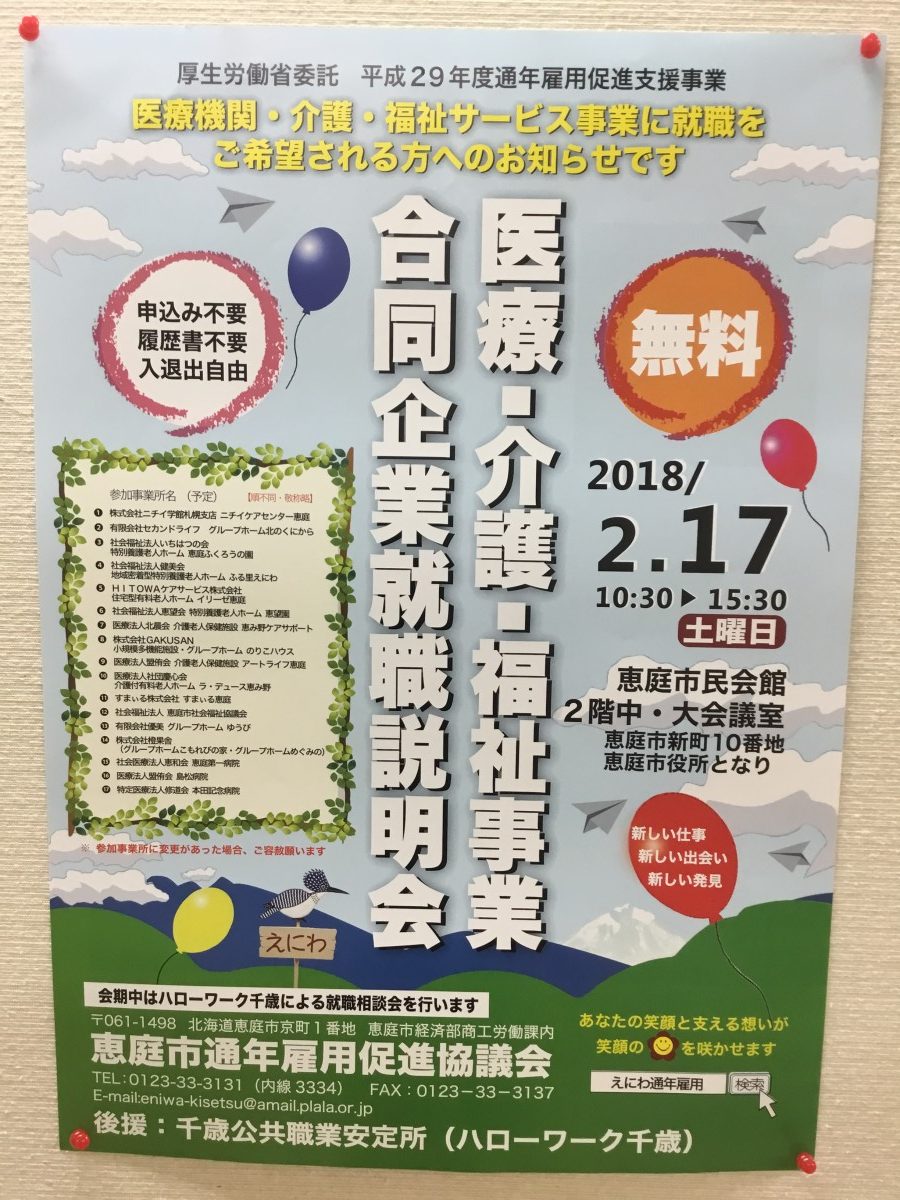 先日の2月17日(土)、恵庭市民会館にて『医療・介護・福祉事業 合同企業就職説明会』へ参加してきました。