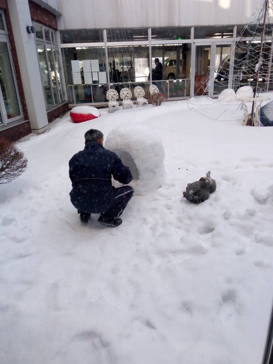 そんな、厳しい北海道の冬を過ごす中で、当施設の中庭には写真の様な、ミニチュアの『かまくら』がいつの間にか出来上がっていました。