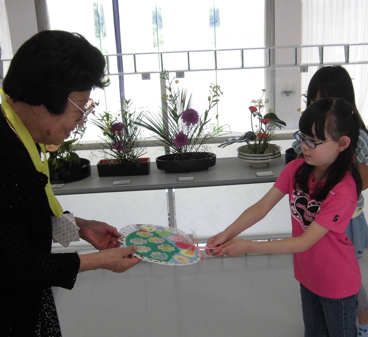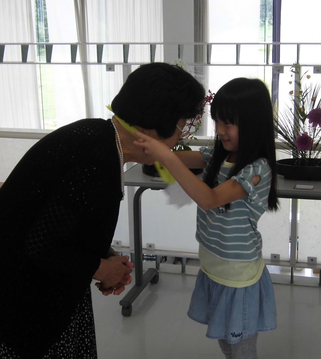 夏休み中なので、小学校1年生のかわいらしい女の子2人が、メダルを首にかけてくれ、お手製のかわいいうちわをいただきました。