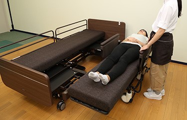 これにより、利用者さんは臥床したままで安全に車椅子に移乗できるようになります。職員は腰への負担、利用者さんのけがや転落について心理的負担が軽減します。