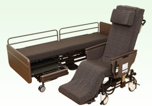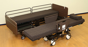 見た目は従来の電動ベットと変わりありませんが、シンプルで高級感があります。ベットから車椅子に変身したいときにリモコンを操作すると、ベットが縦に2つに分離し、分離されたほうがギャッチアップできる車椅子に変身します。