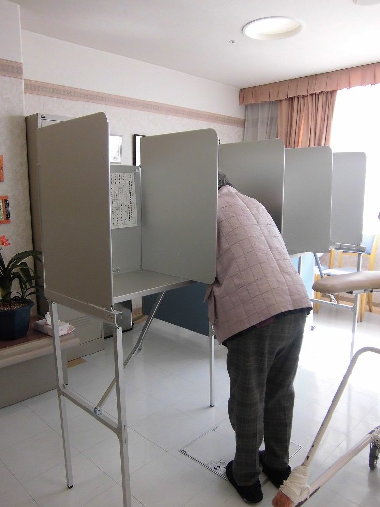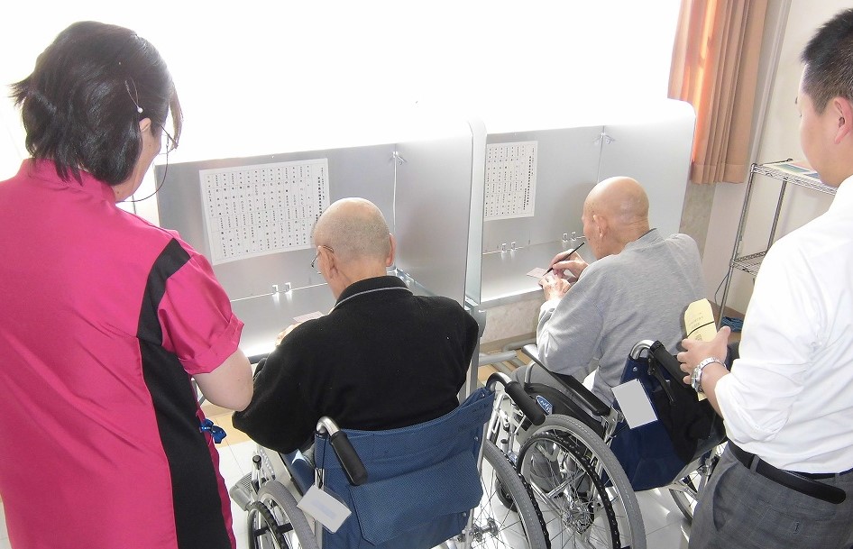 投票された利用者さんは、写真にある通り自ら投票台で記入し、投票しました。代理投票補助者を希望する方もいませんでした。
