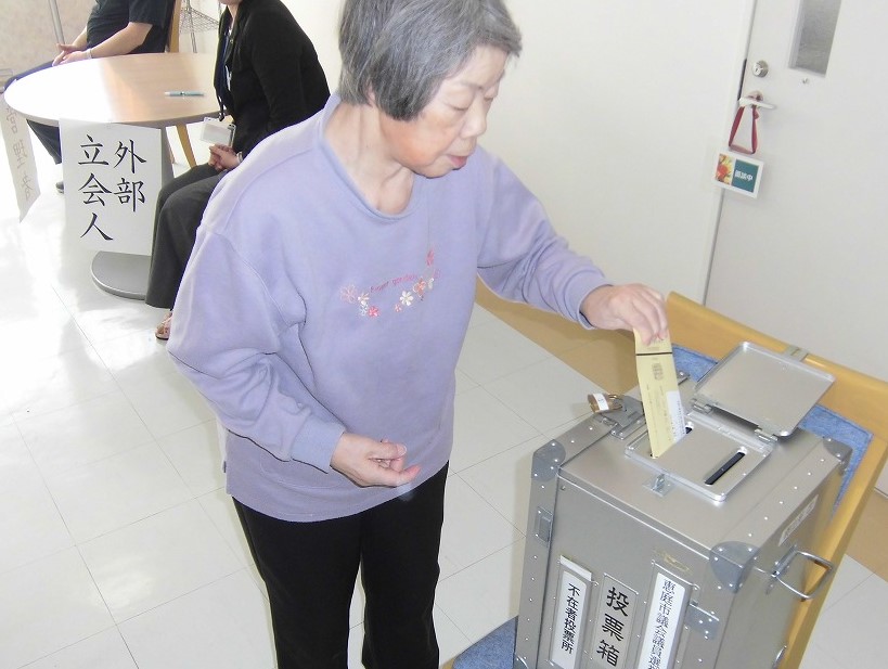 今回、選挙会場に行けない利用者の方がおりましたので、当施設に不在者投票が行えるように特設会場を設け、外部立会人(市に選出していただきました)を依頼し、しっかりと管理運営をさせていただきました。