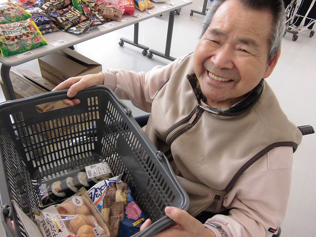 皆様、売り場に陳列された美味しそうなお菓子や果物、新商品の焼き芋などをご家族、職員と一緒に見てまわり、楽しそうに買い物をされていました。