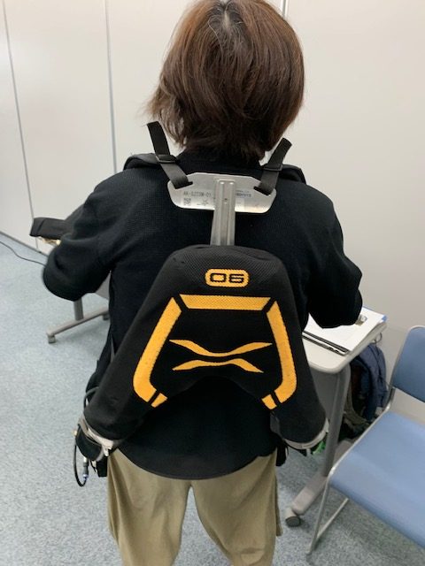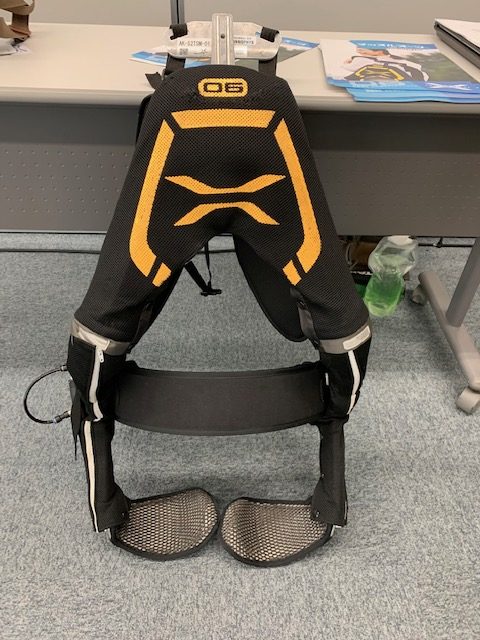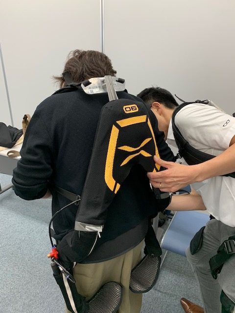 この展示会では5製品が展示されておりましたが、今回は時間の関係上「マッスルスーツ」という製品を体験してきました。この製品は介護職員の腰を守る道具であり、ご利用者様へも安心で安定した介助を実現できる補助器具として開発されたものです。