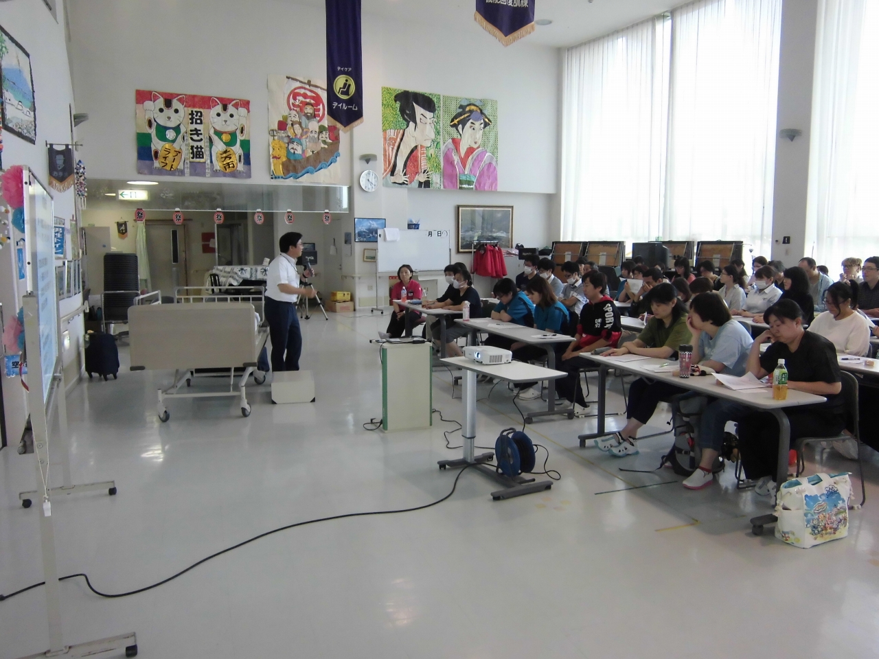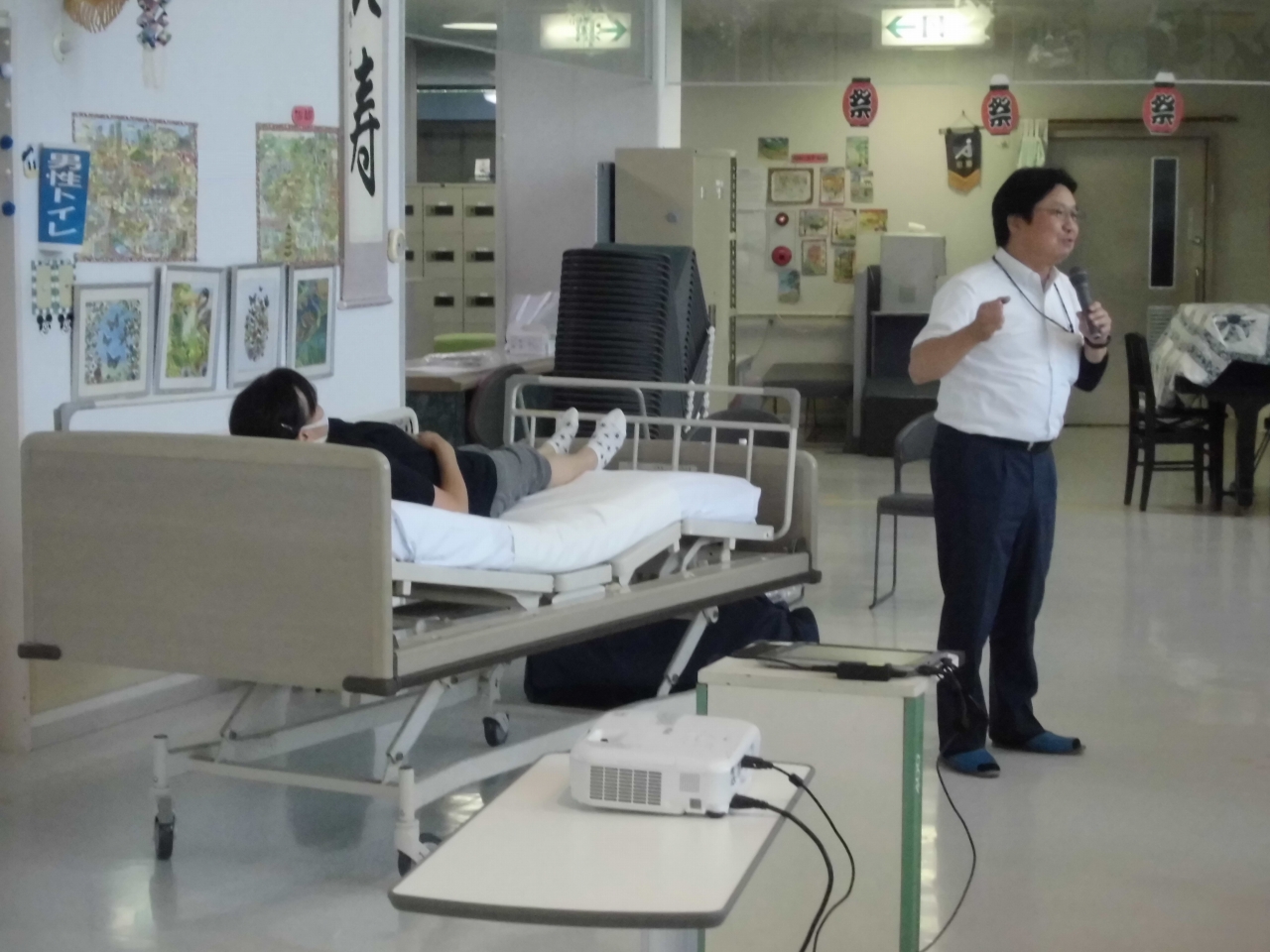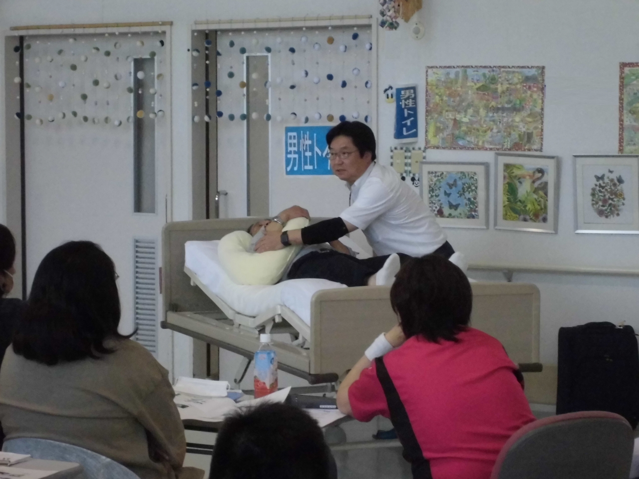 『利用者の「安楽なポジショニングについて」考える』をテーマに(株)モルテンの「千葉 豊」氏に講師を依頼し、アートライフ恵庭の中で一番広い1階のハーモニーホールで開催しましたところ、68名の職員の参加がありました。実際にベットを使い、職員が利用者の代わりになって思いを共有しながら実習を行うという実践的な研修でした。