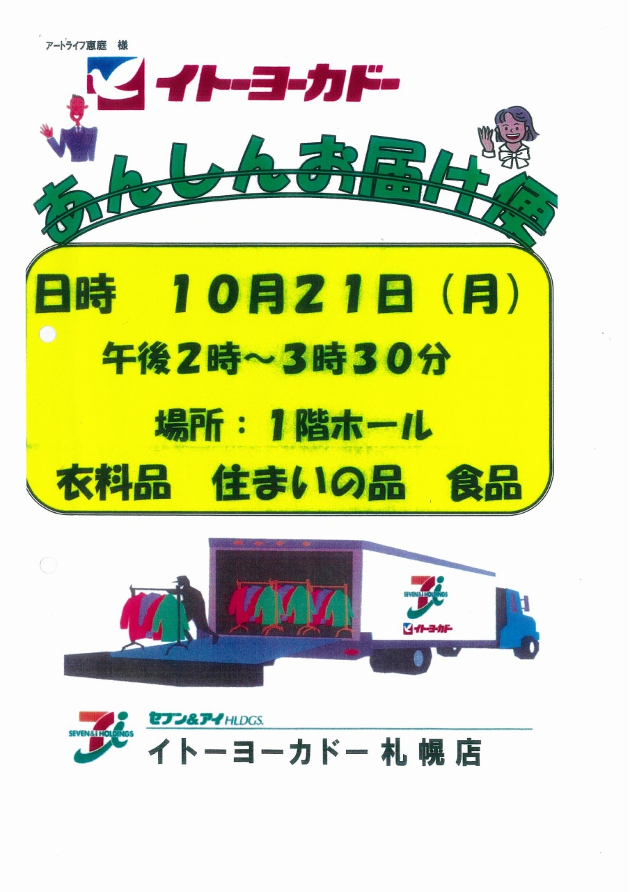 これまで20年近く年2回施設の行事として開催していた「ふれあいショッピング」がイトーヨーカドー恵庭店の閉店に伴い、開催が危ぶまれていました。が、なんと救世主が現れました!!