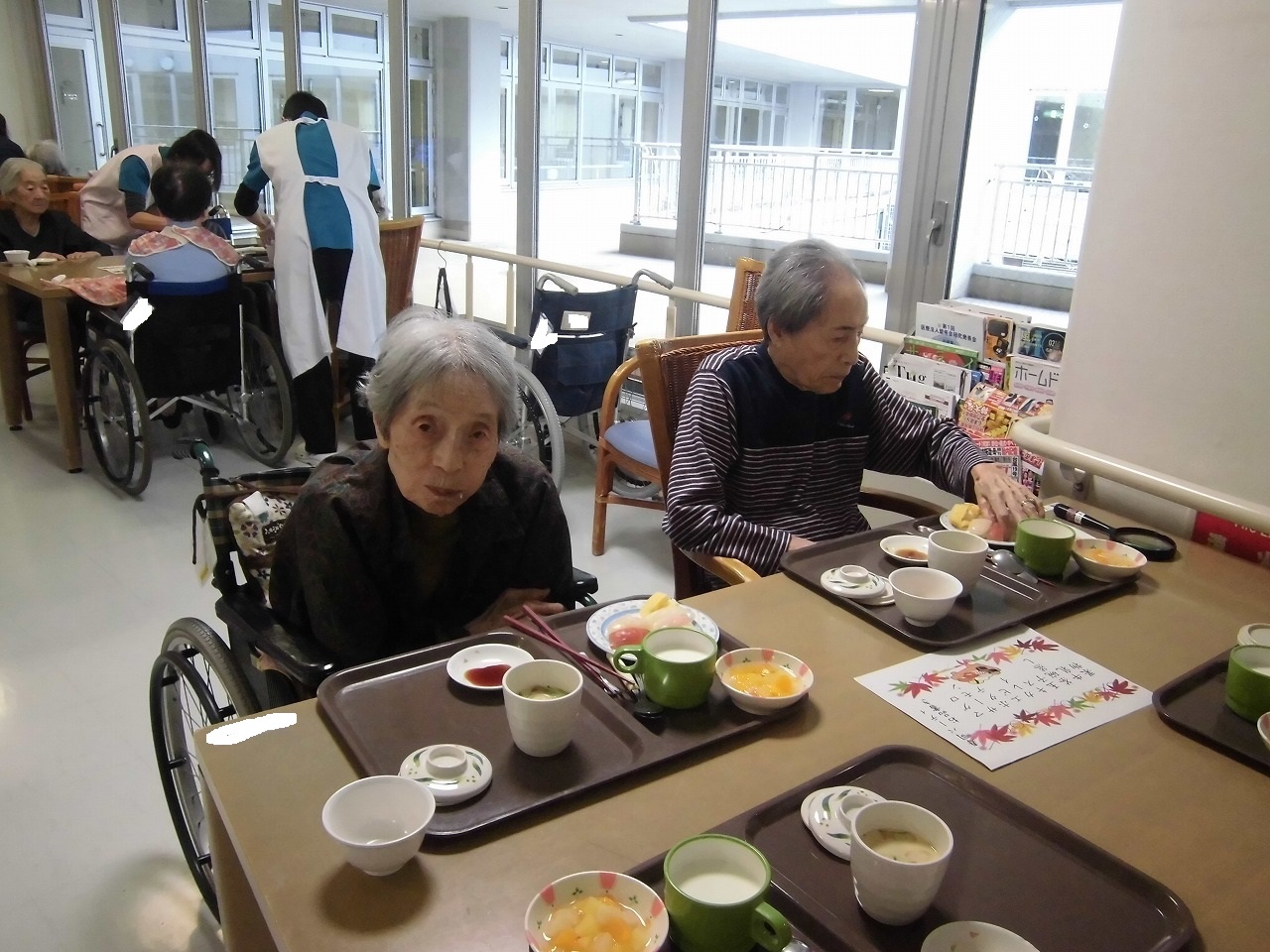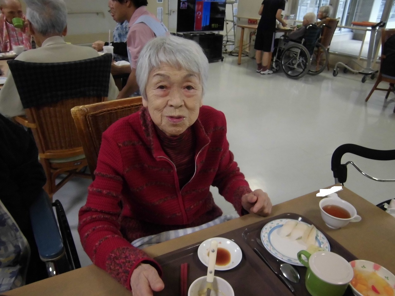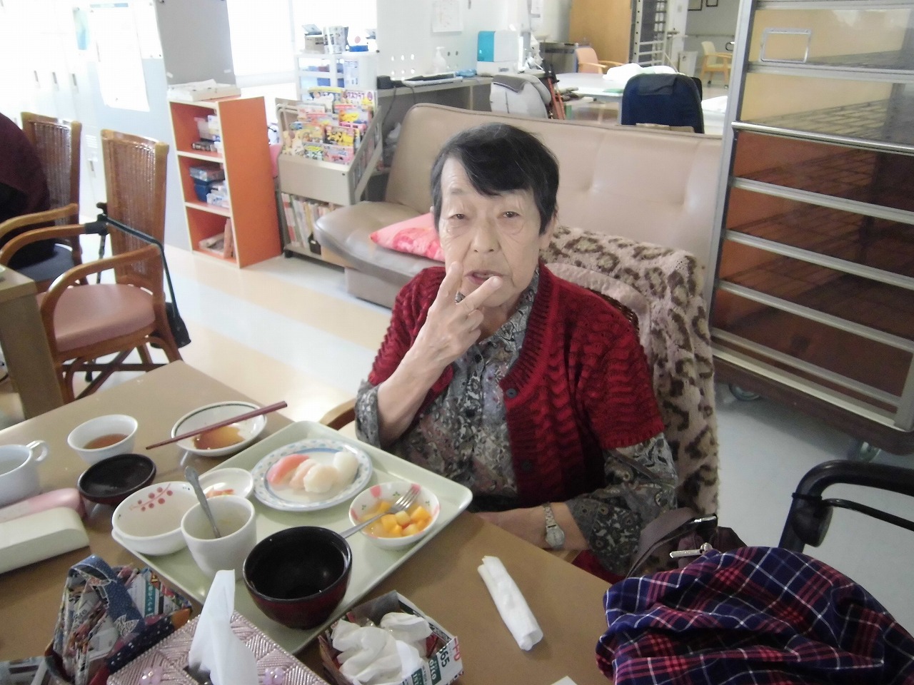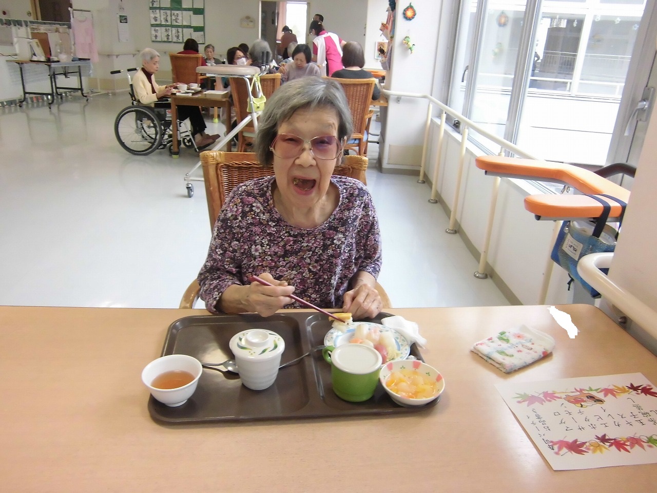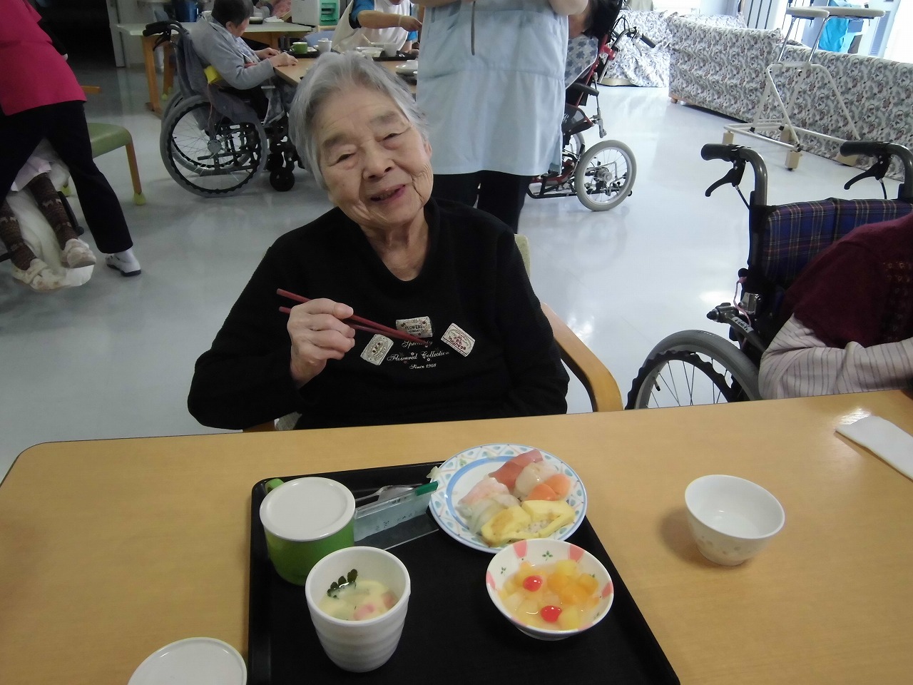 生寿司の他に茶碗蒸しとフルーツもあり、茶碗蒸しは当施設での人気メニューの1つで、こちらも大変喜ばれていました。美味しい物を召し上がる姿は、幸せ感満載で、食事の力ってすごいなと改めて感じました。利用者様の笑顔を見るために、明日も頑張ろう!と思った1日でした。