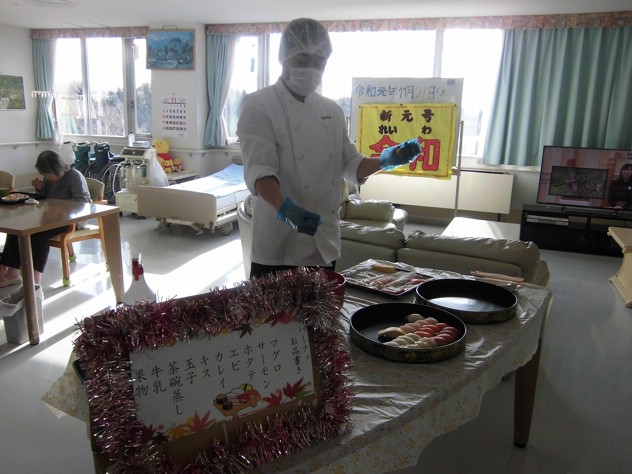 寿司パーティーは、何日も前から楽しみにされていて、大変人気の行事の1つです。当日朝9時から3人の寿司職人がサーモン、カレイ、マグロ、玉子、キス、エビ、ホタテの7種類、合計1,000貫程の寿司を握り盛り付け、食事時間に合わせて利用者様の前で握っていただくデモンストレーションもあり、おかわりもその場で頂けます。握りたてのお寿司は大変軟らかく、口に入れるとお米がほろりとほどけ、普段、食事量の少ない方も、生寿司だけは別と言う方、五感を刺激されおかわりの手が止まらない方、皆さん本当に美味しそうに召し上がられていました。