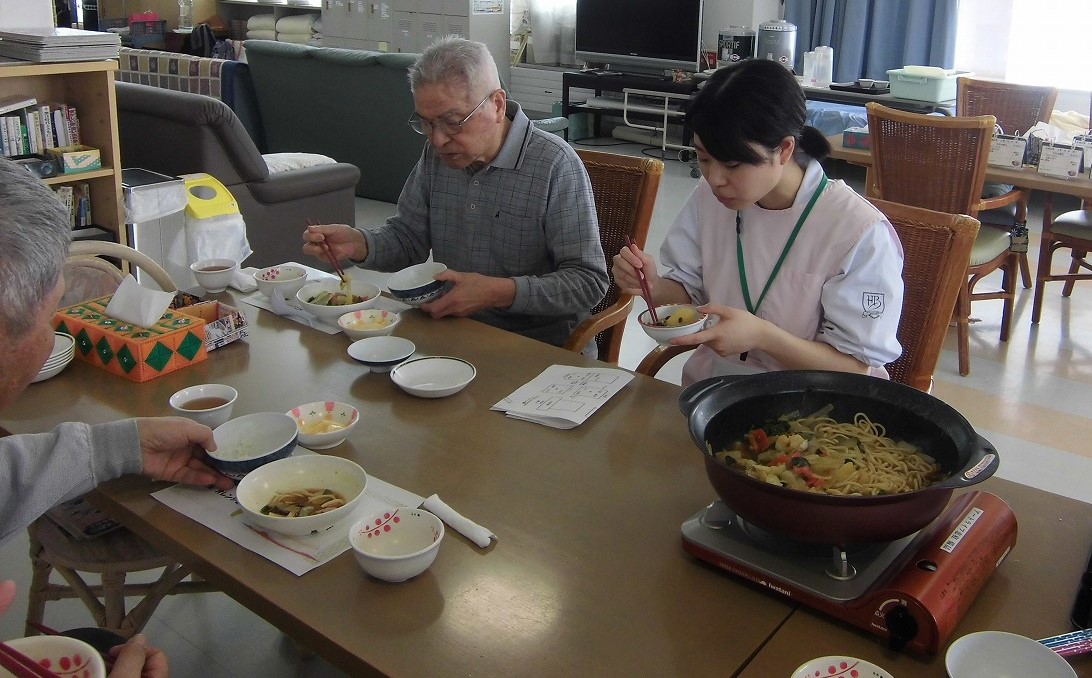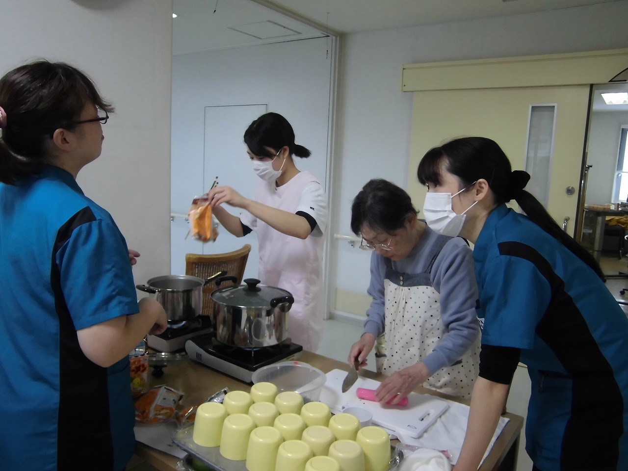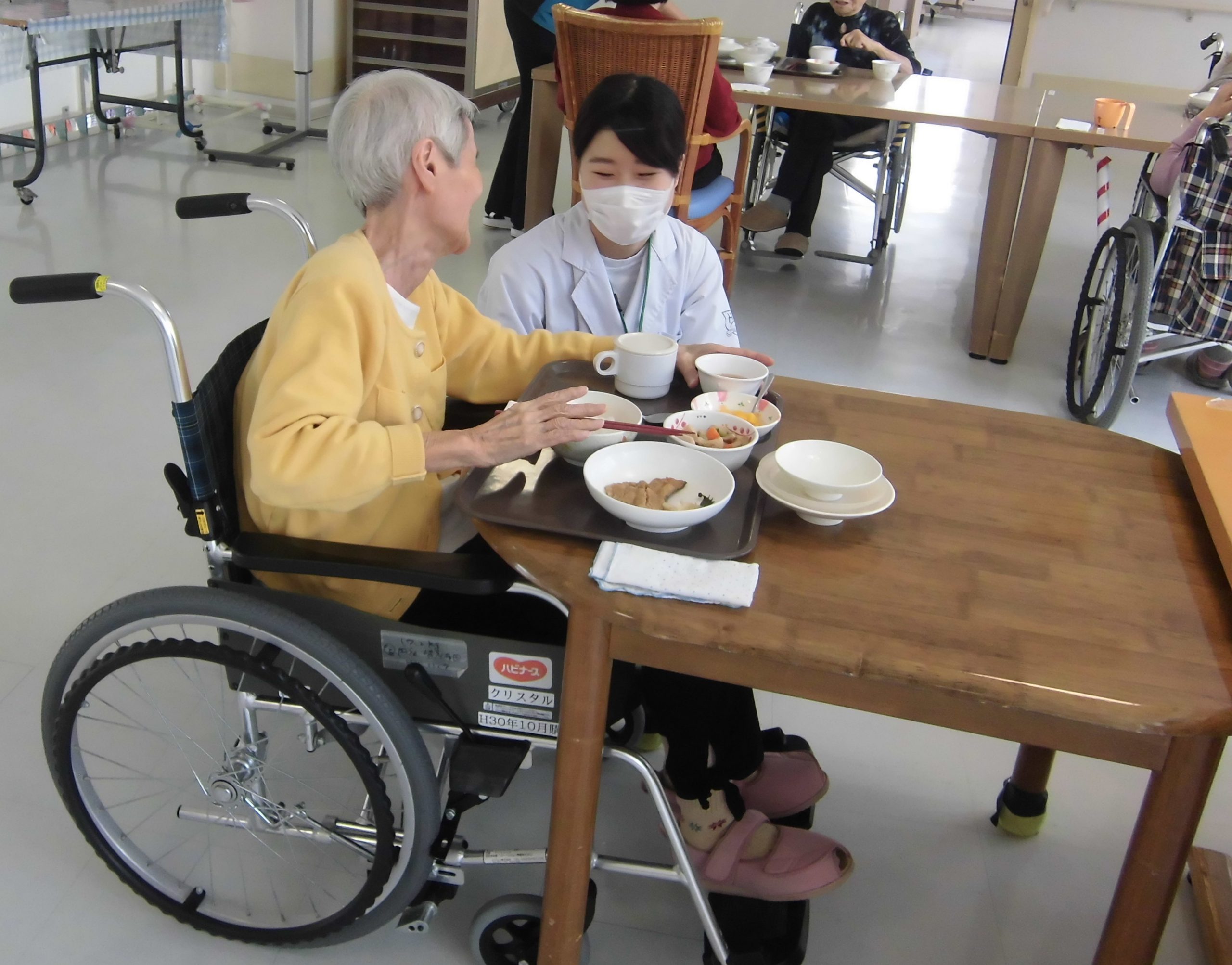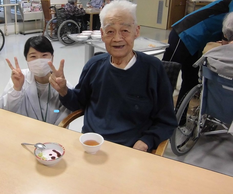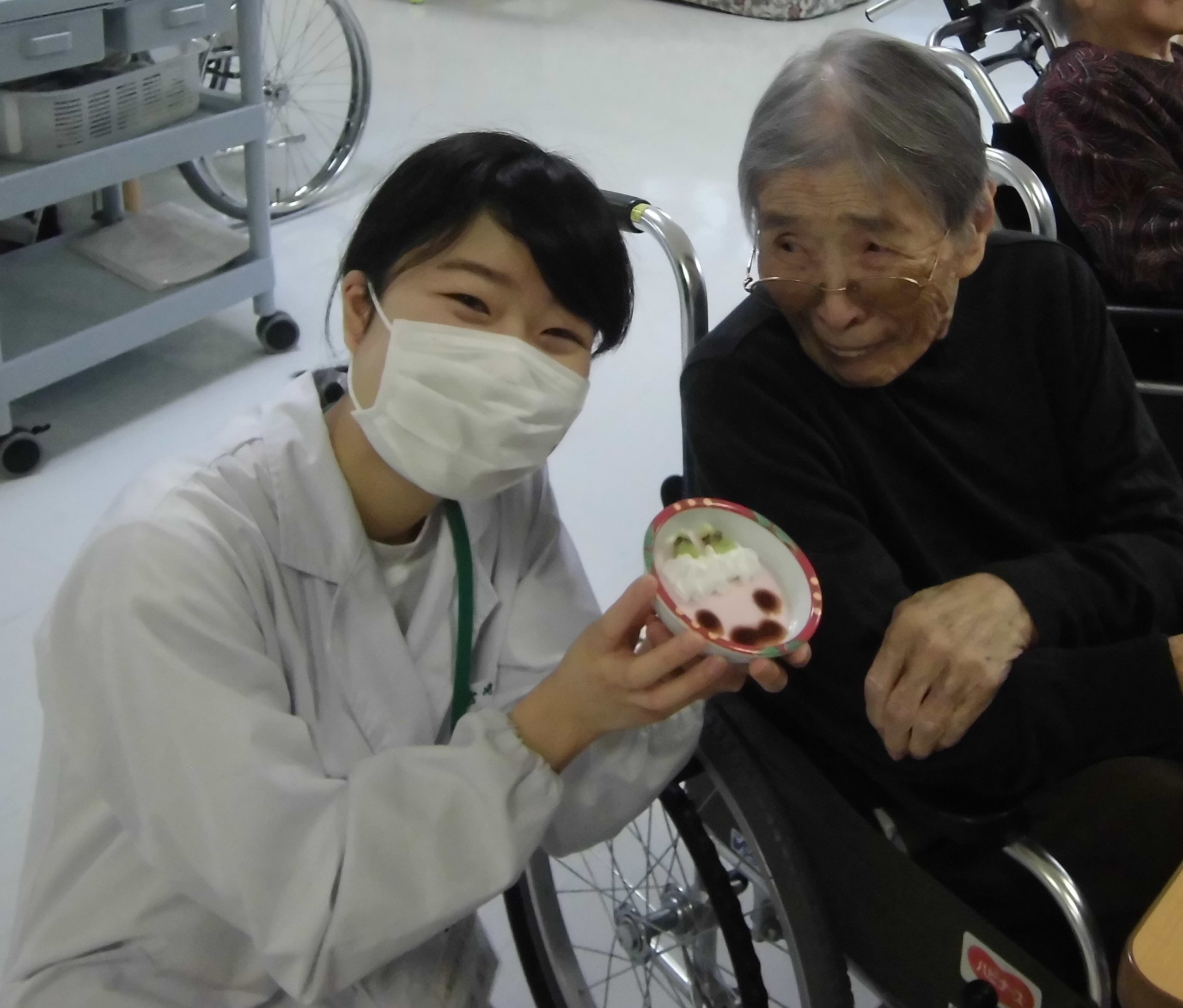 厨房内業務は、盛り付けや、野菜の切込み、昼食時には、担当利用者様の食事介助、多職種とのカンファレンス参加、節分行事での間食「鬼ババロア作り」やレクレーションの参加、通所での鍋パーティーと、利用者様とコミュニケーションを深めていく中で、素敵な笑顔も見せてくれました。