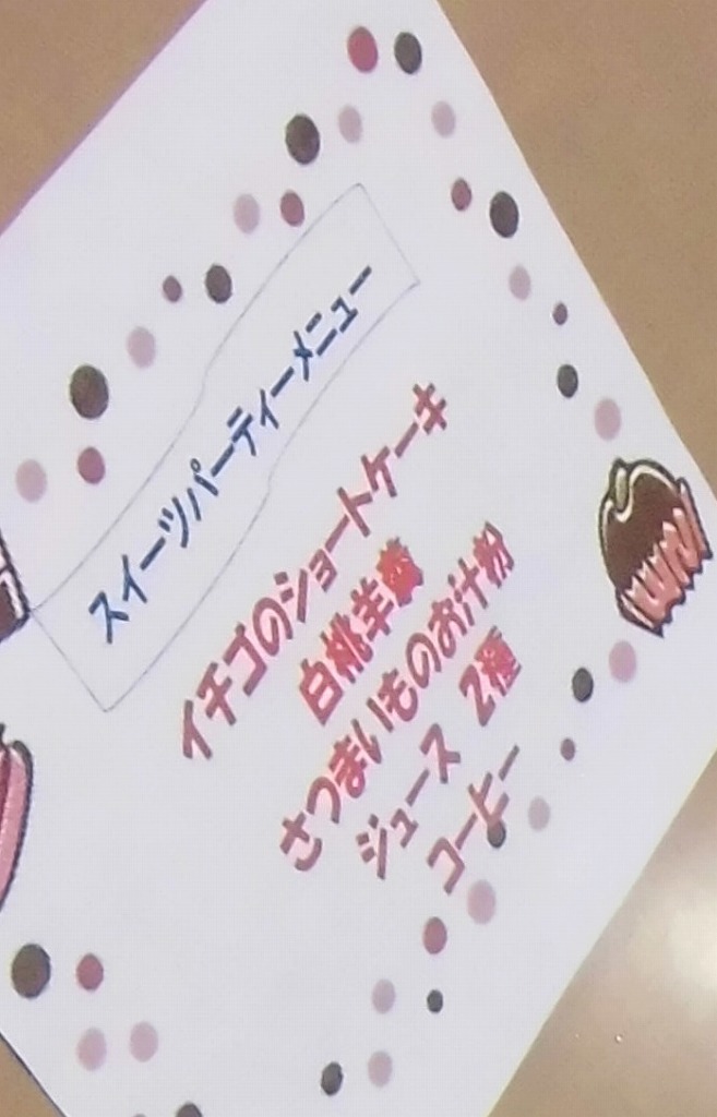 4月8日に各フロアーで「春のデザート祭り」が行われました。メニューは、ケーキ・さつまいものお汁粉・羊羹などなど。しょっぱい物好きの方にせんべいもあり、飲み物はコーヒーかジュースが選べます。