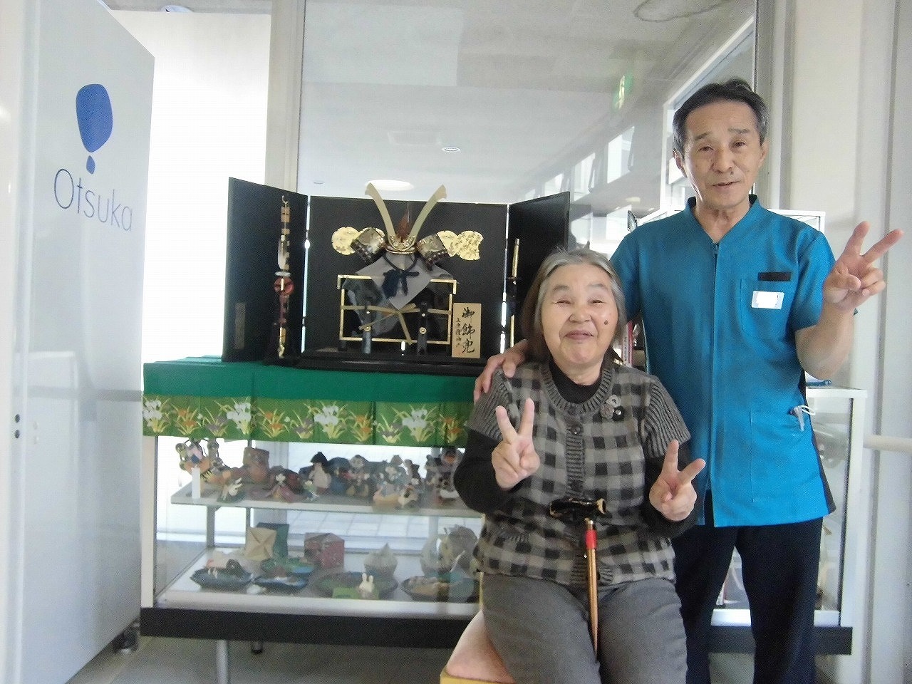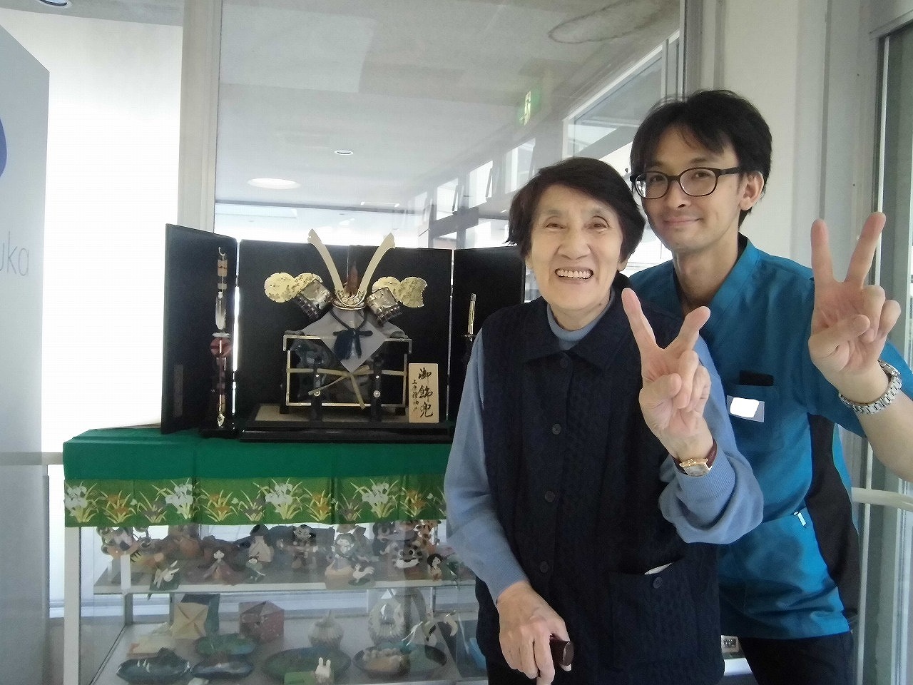 施設に飾ってある五月人形を載せましたが、結構沢山ありビックリしました。早速、見に来て下さった方がいらっしゃいましたので、嬉しくて、シャッターを切りました。皆様とても良い笑顔ですね。中には、お宝級の兜もあり、何時から施設に飾ってあるのか?知っている職員も少ないと思います。