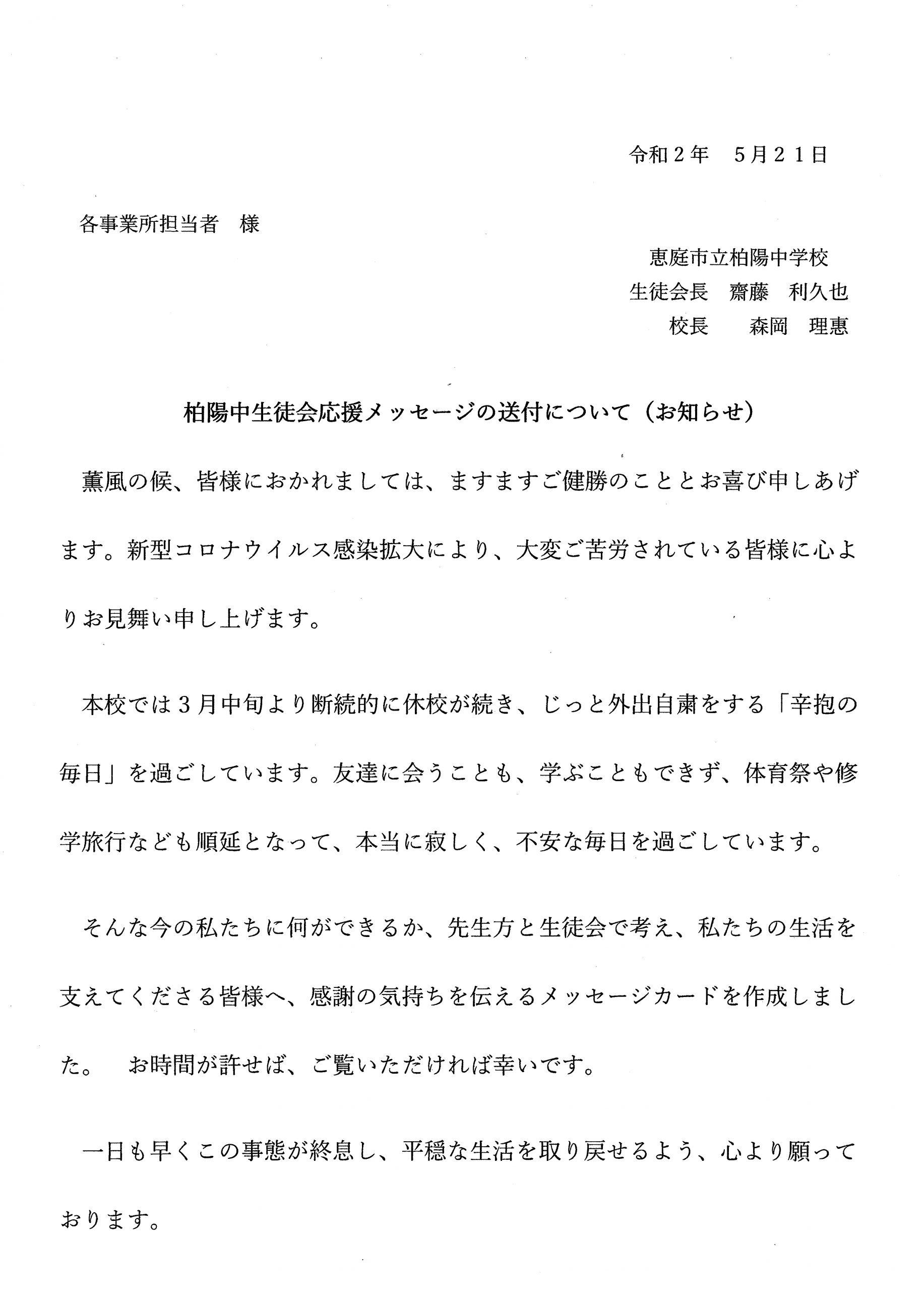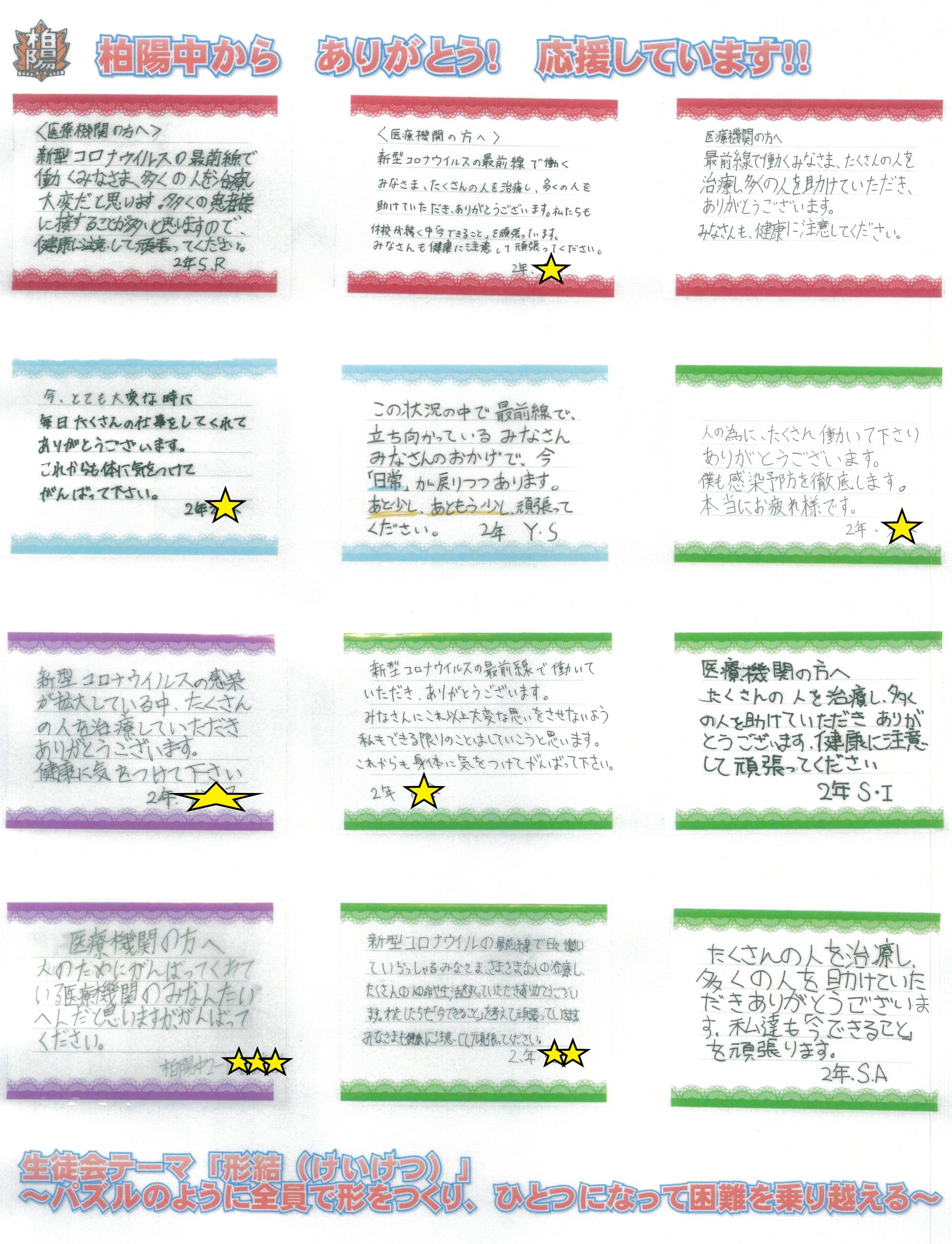 柏陽中の皆さん。応援ありがとうございます!! 掲載日:2020.05.26 たびたびの花より団子でございます。 政府はコロナウイルス緊急事態宣言を解除としたところではありますが、北海道はまだまだ気が抜けない状態となっておりますね。 そんな中、恵庭市立柏陽中学校の生徒さんから沢山の応援メッセージをいただきました!! 『ありがとう』を言うのは私たちです。 これを励みにまだまだがんばれそうです。