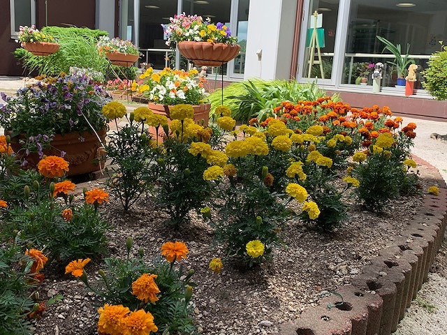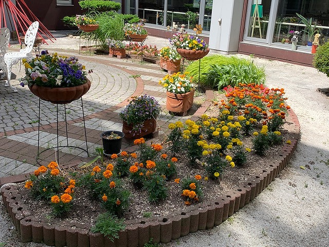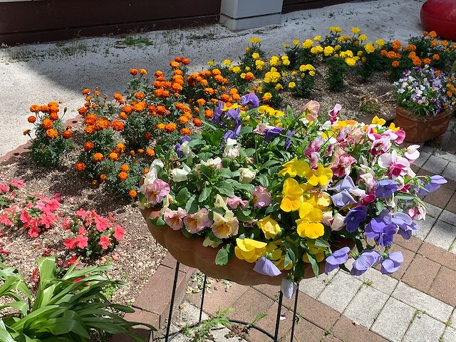 さて、少し明るい話題はと思い、1ヶ月程前に植えた中庭の花の成長をお知らせいたします。植えた直後(5月中旬)以降は少し肌寒い日々が続いてしまい「花達大丈夫?」と利用者さま達ともお話をしていました。でも、心配はよそにお花達はすくすくと成長を続け1ヶ月程ではありますが写真の様に綺麗に咲いてくれました。利用者さまも2階、3階の窓からお花を鑑賞してもらい「綺麗だねー」と口々に言ってもらっています。私達職員も利用者さまとともに「ちょっと一息」する瞬間を感じています。